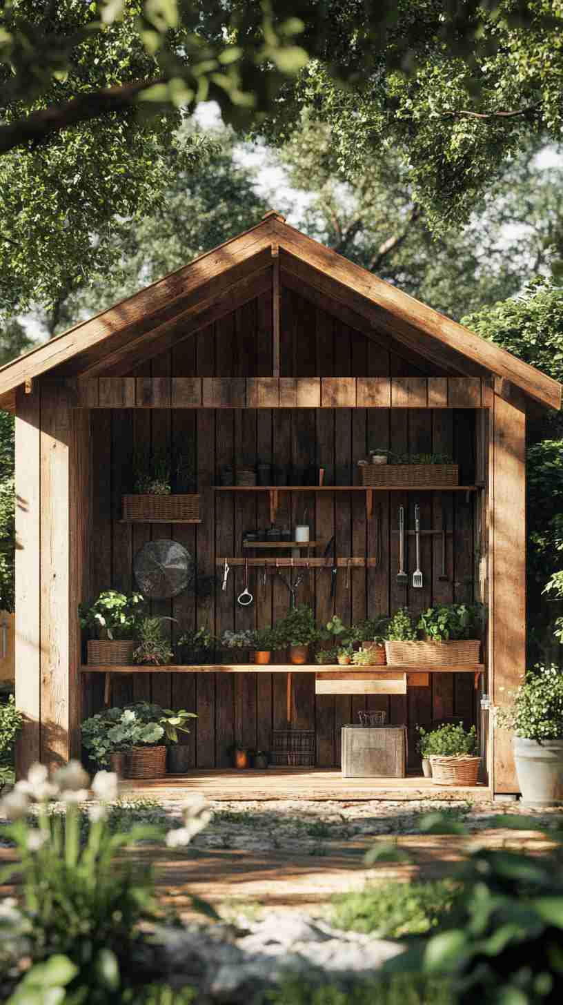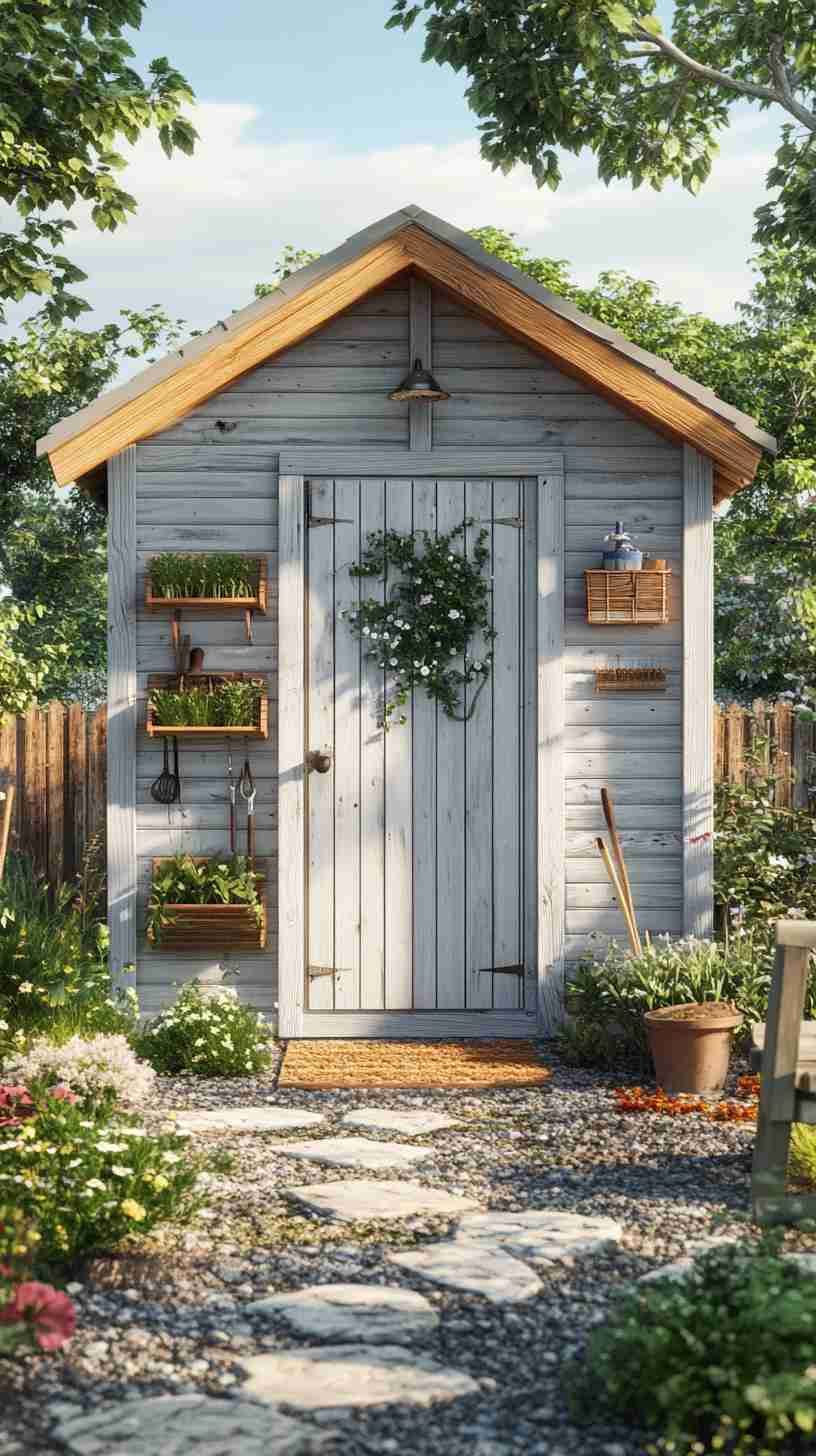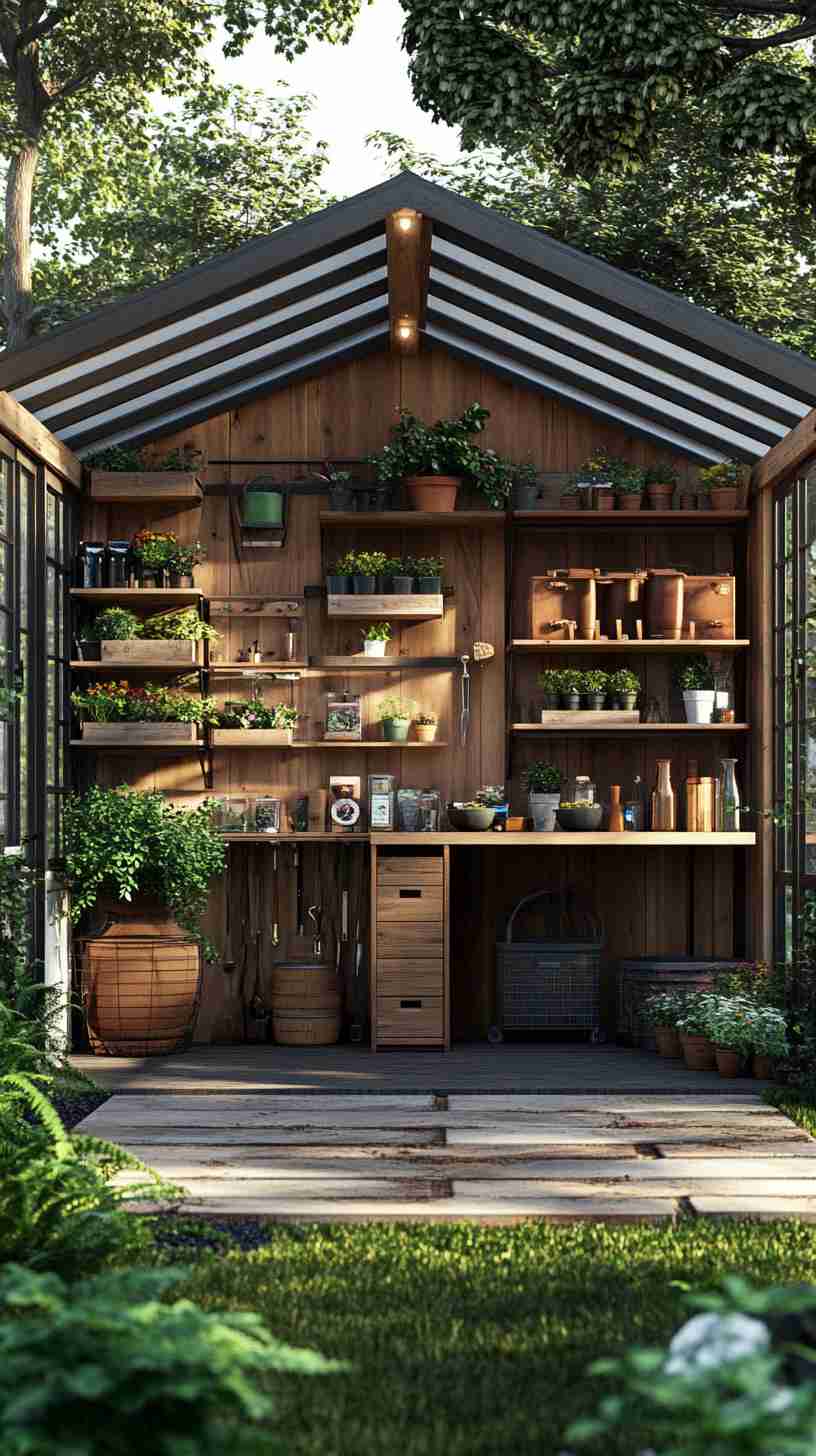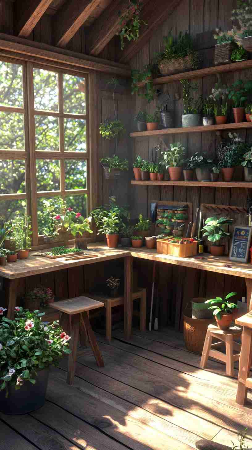 - Functional Details: Elements like gardening tools, workbenches, potted plants, or outdoor seating, emphasizing the shed’s practical purpose.