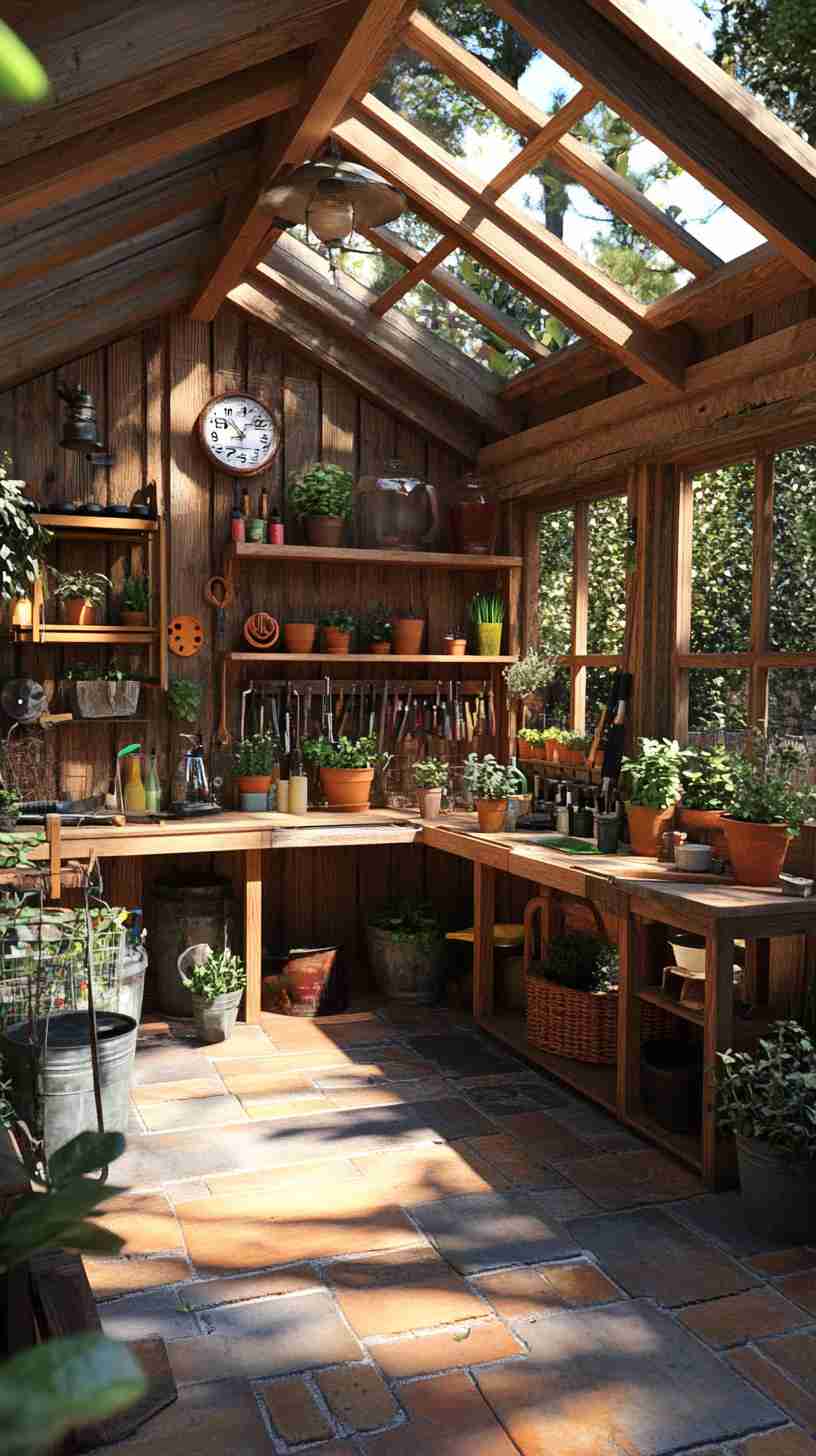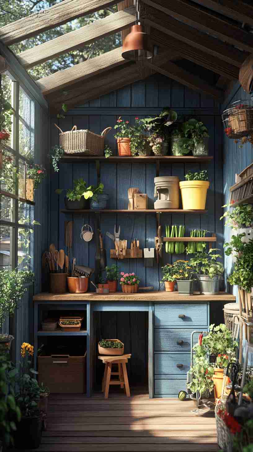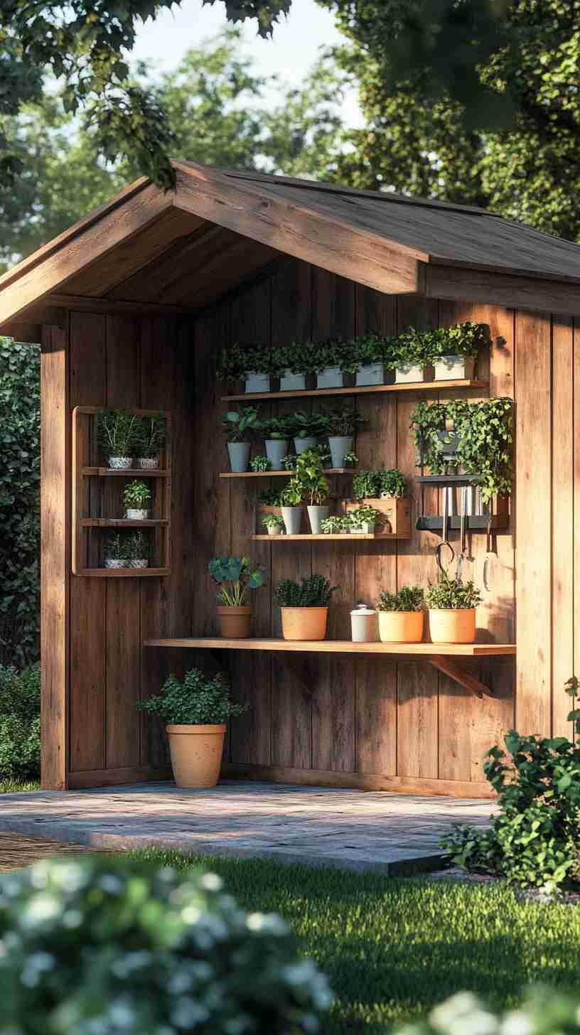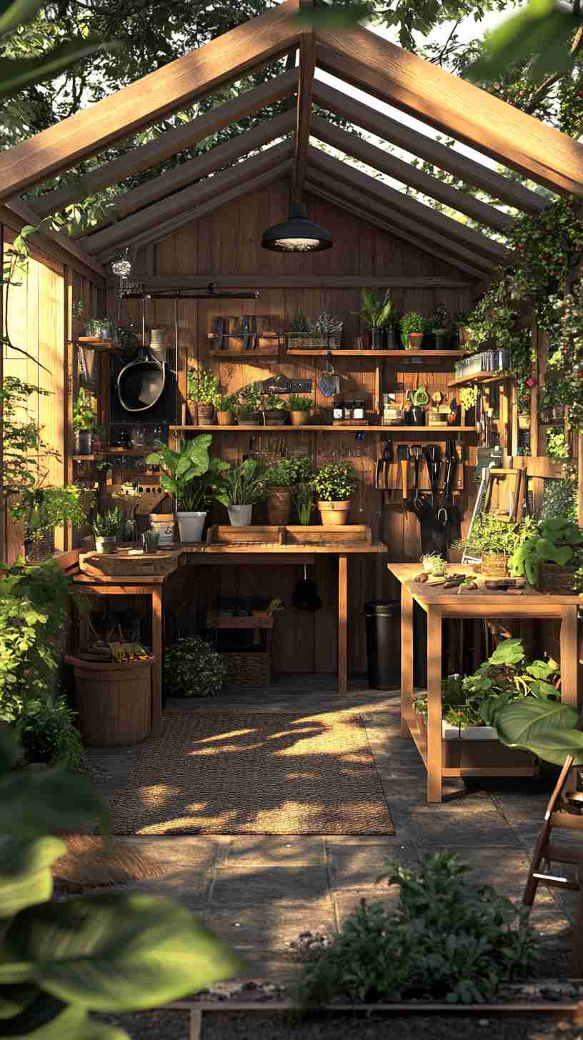 - Functional Details: Elements like gardening tools, workbenches, potted plants, or outdoor seating, emphasizing the shed’s practical purpose.