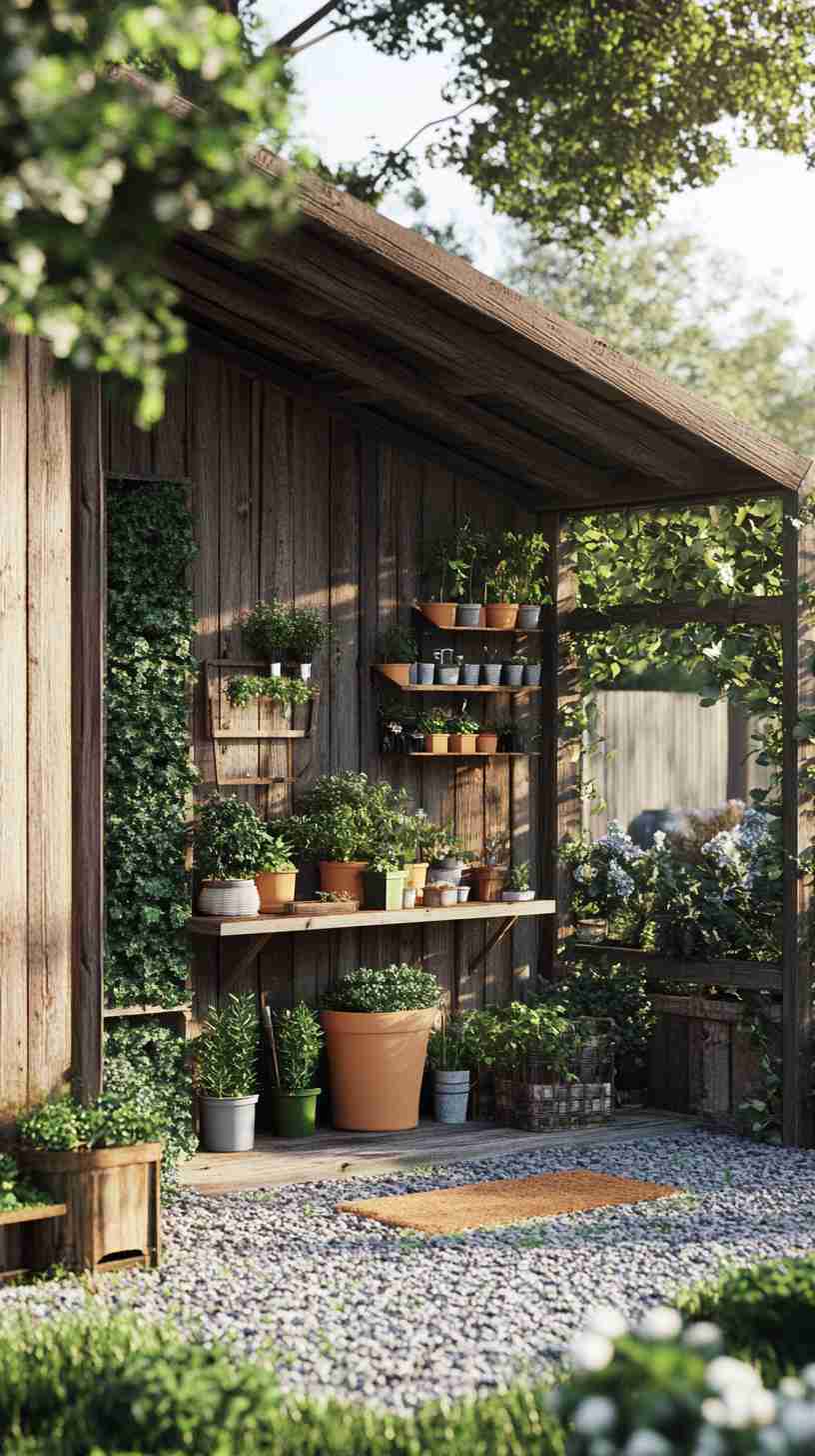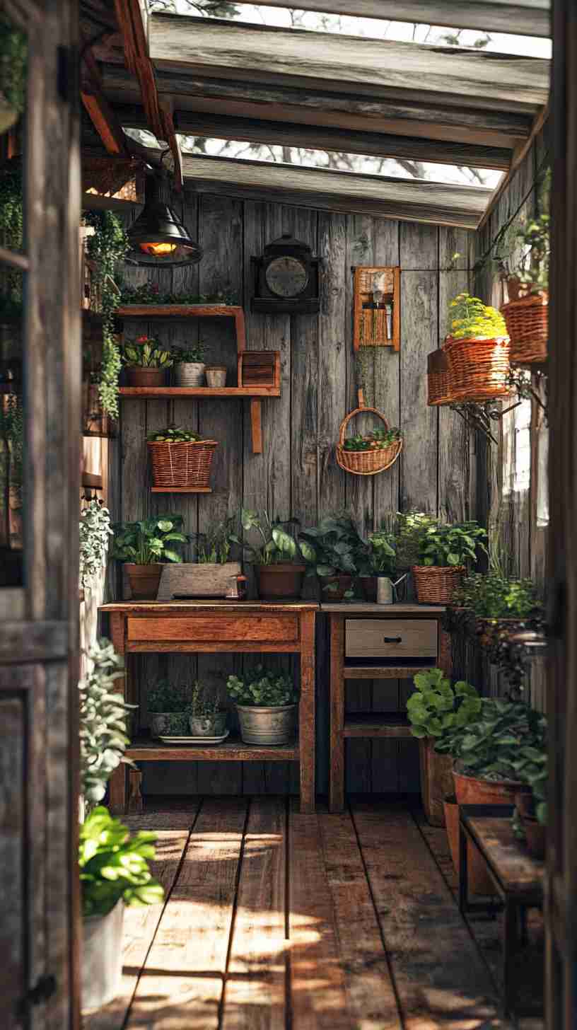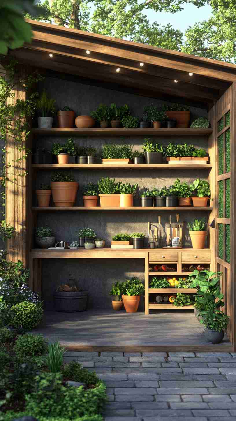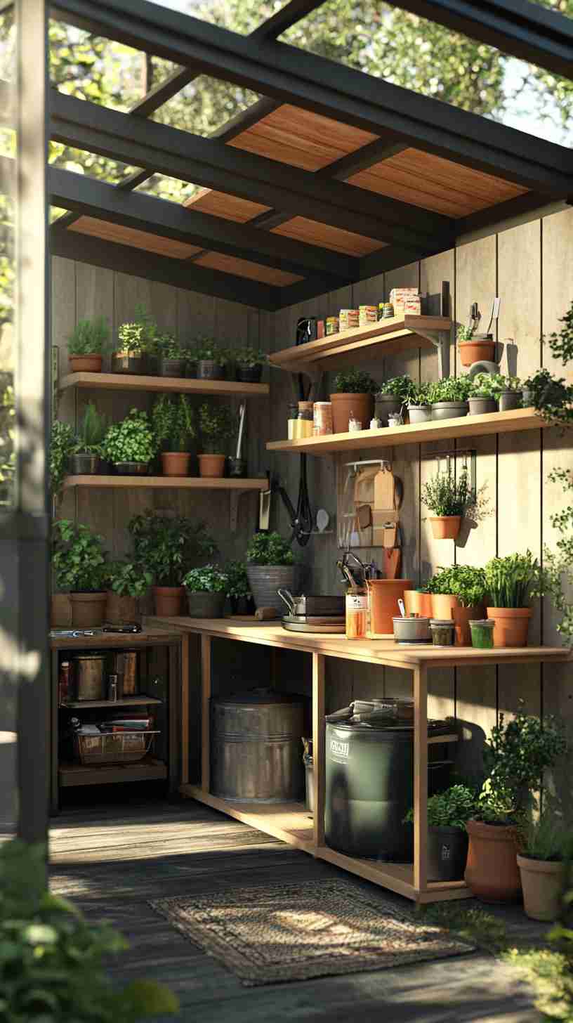 - Functional Details: Elements like gardening tools, workbenches, potted plants, or outdoor seating, emphasizing the shed’s practical purpose.
