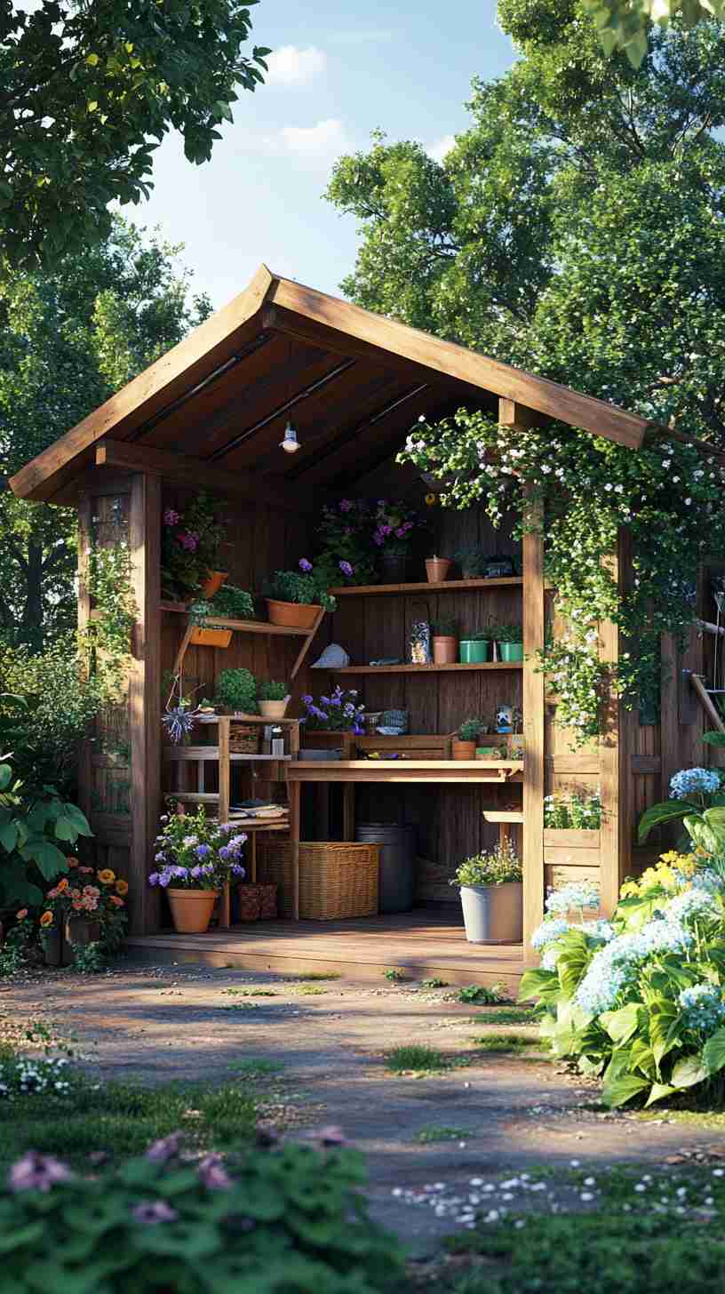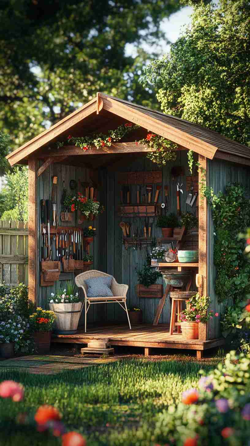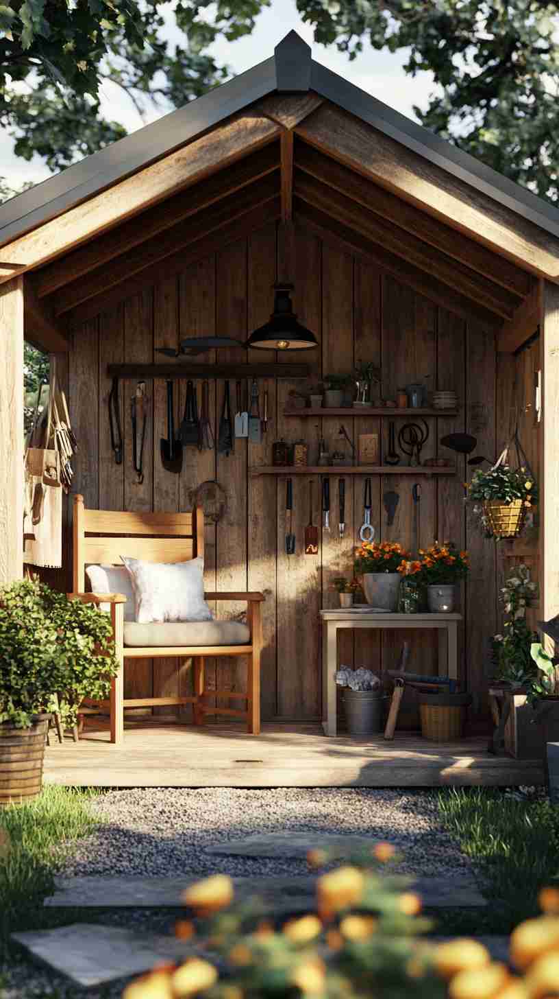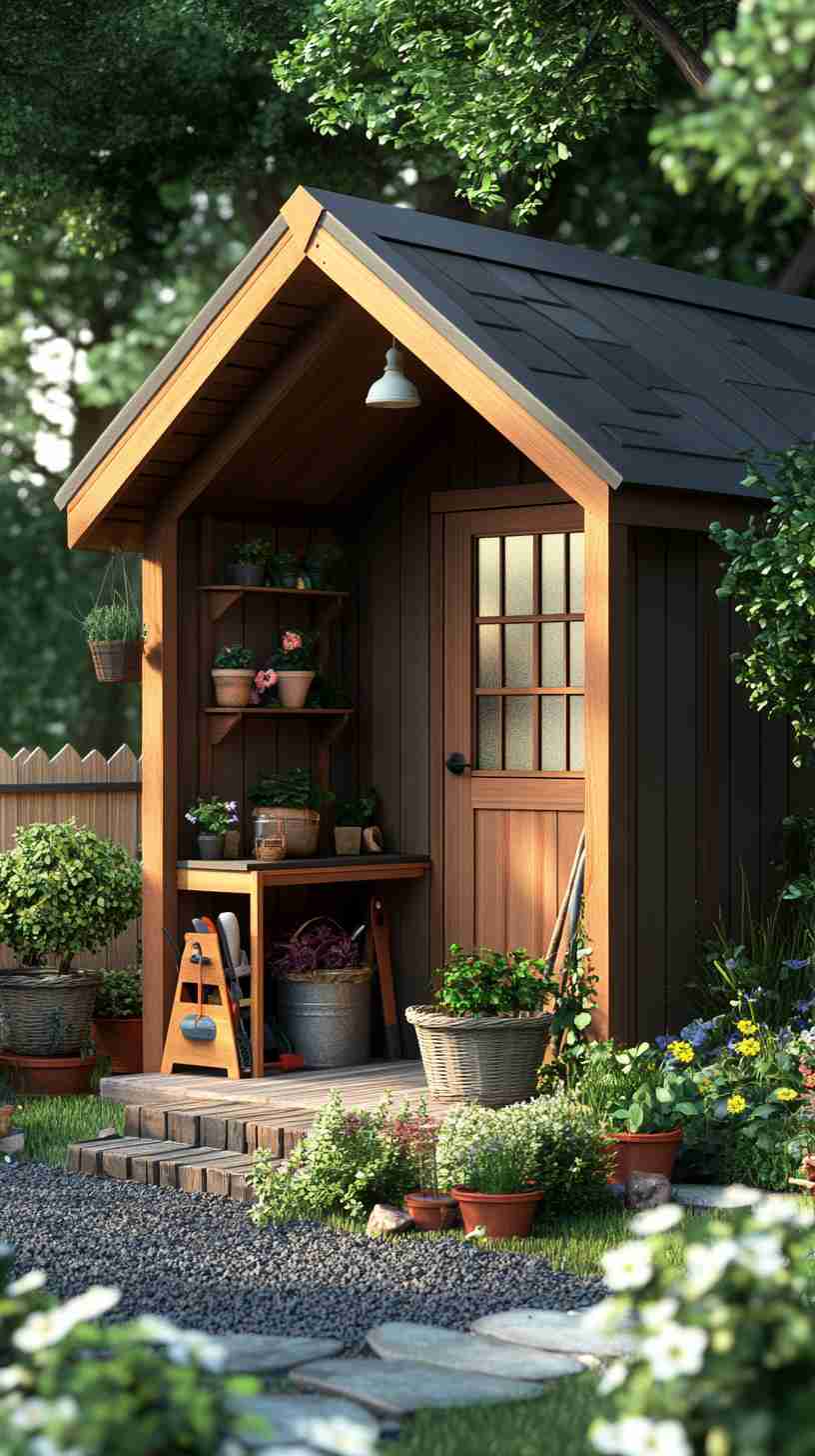 - Functional Details: Elements like gardening tools, workbenches, potted plants, or outdoor seating, emphasizing the shed’s practical purpose.