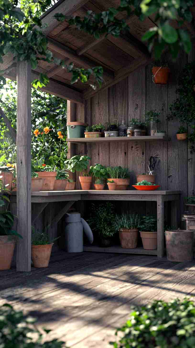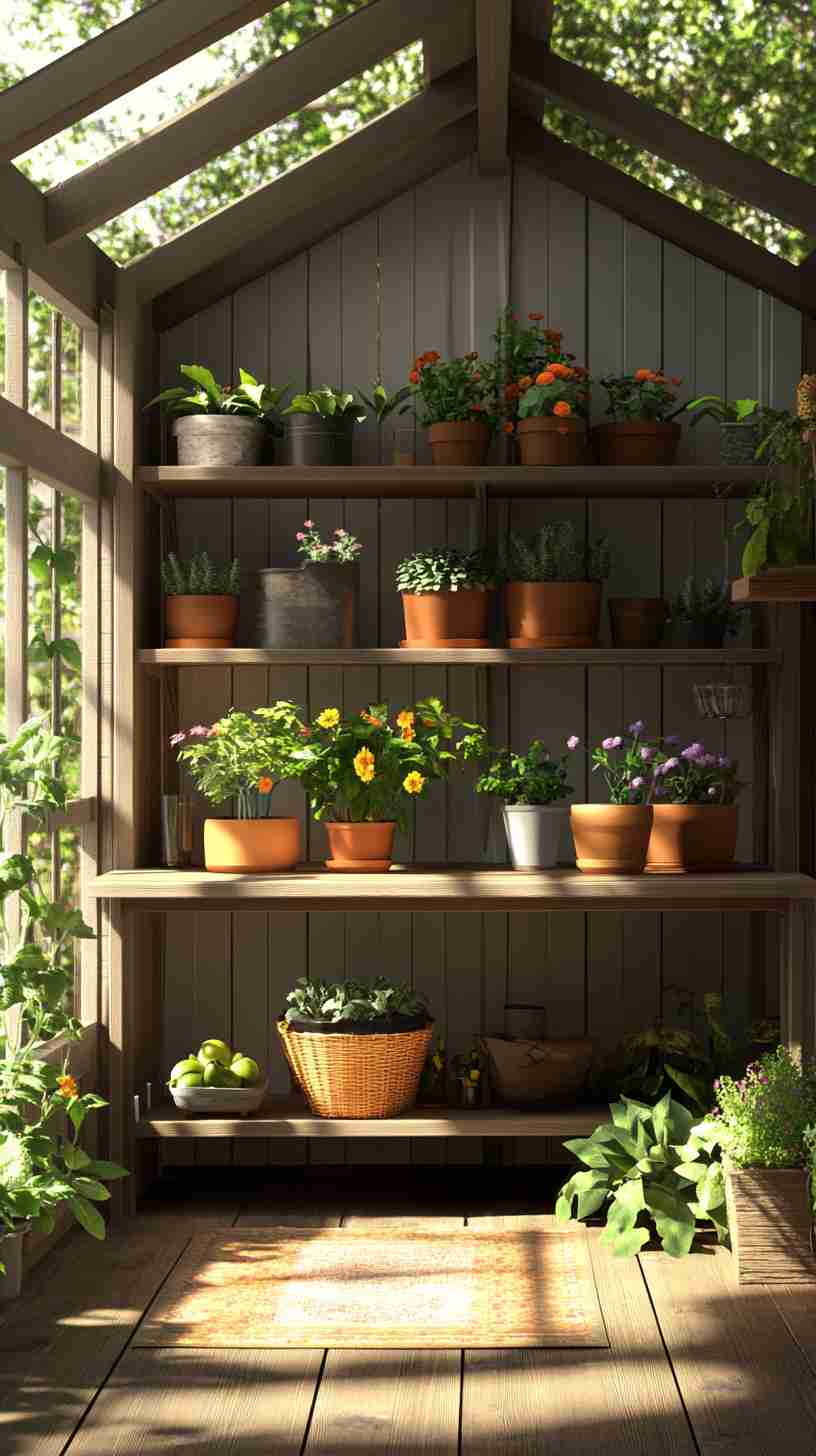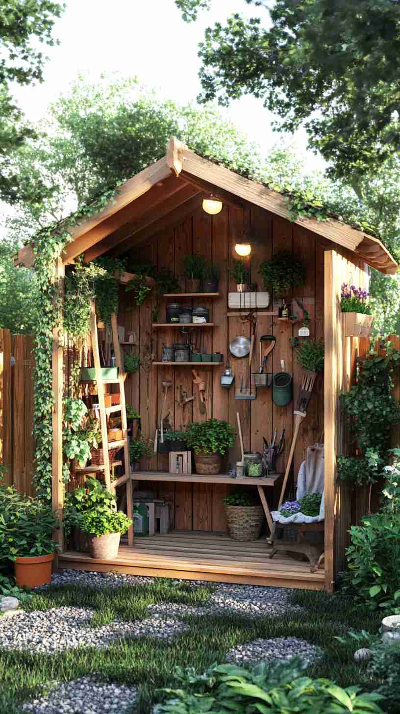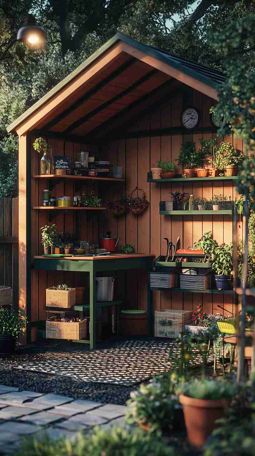 - Functional Details: Elements like gardening tools, workbenches, potted plants, or outdoor seating, emphasizing the shed’s practical purpose.