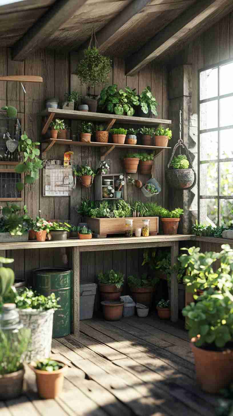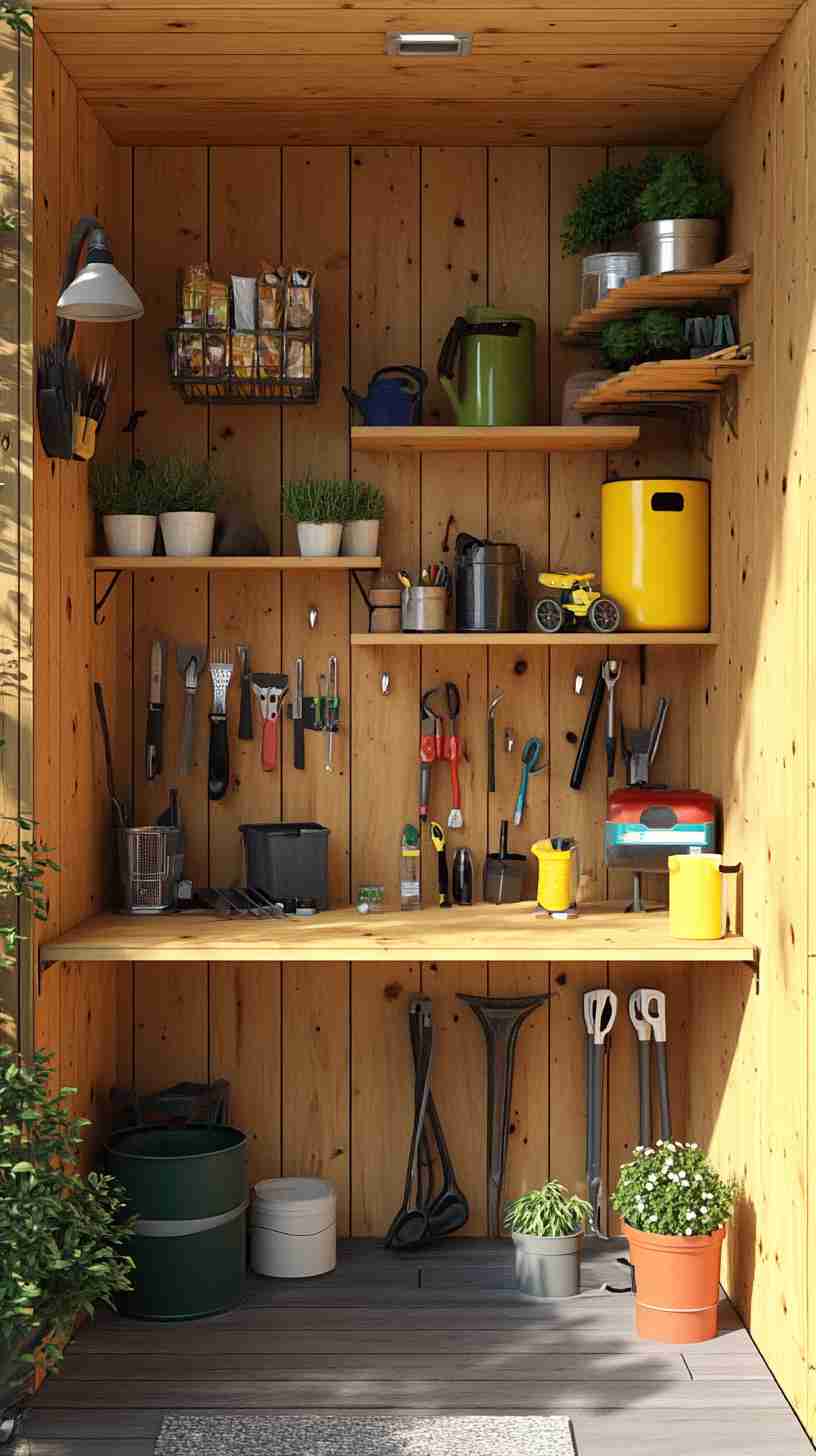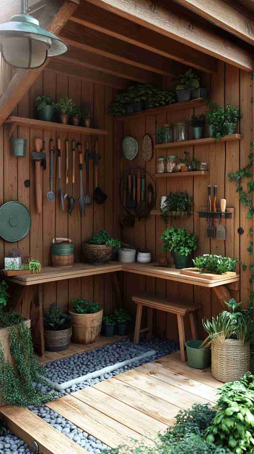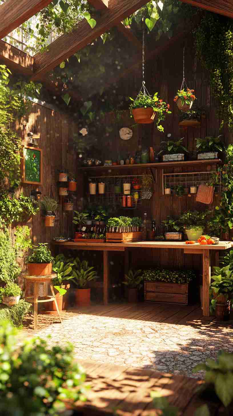 - Functional Details: Elements like gardening tools, workbenches, potted plants, or outdoor seating, emphasizing the shed’s practical purpose.