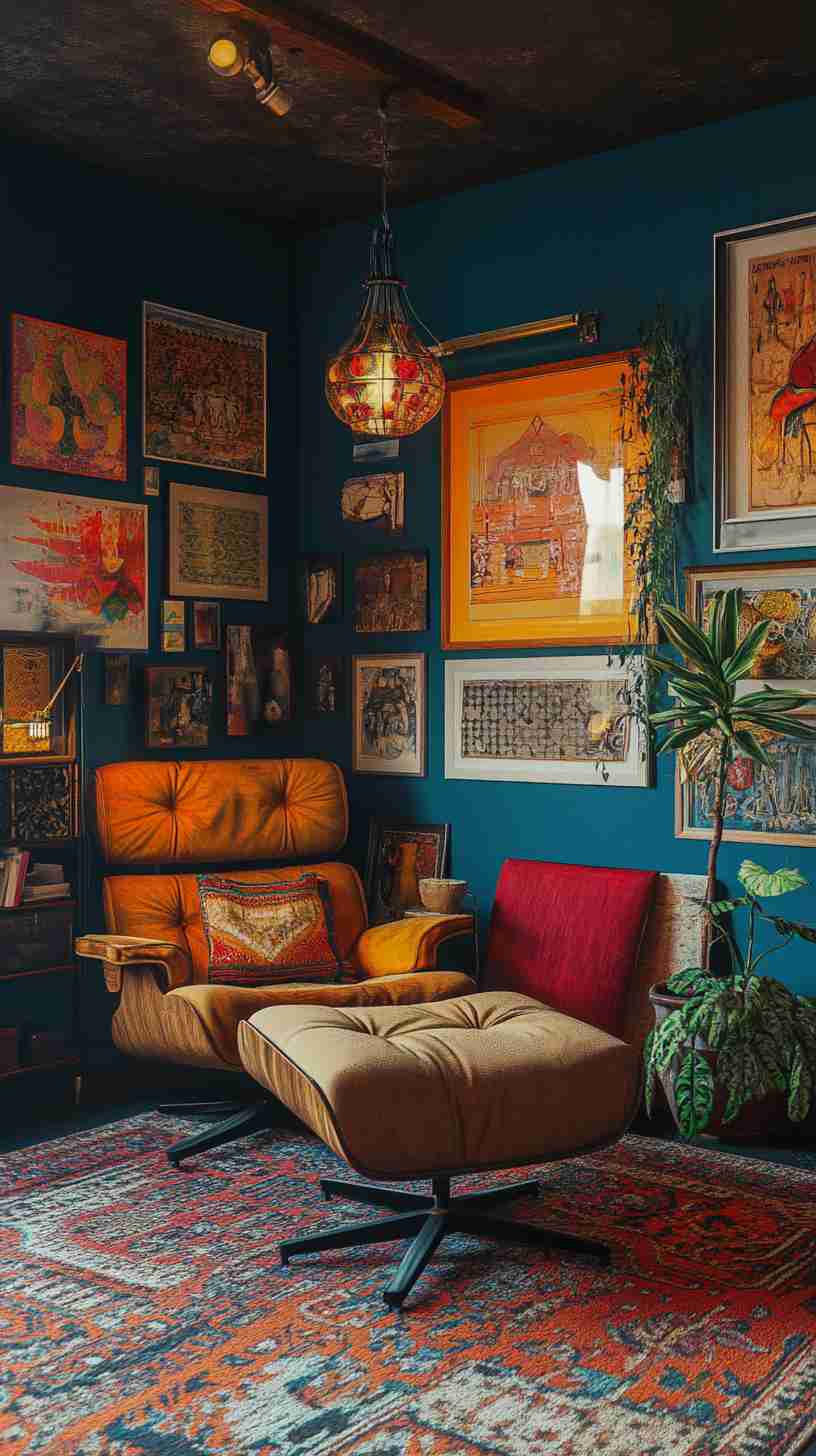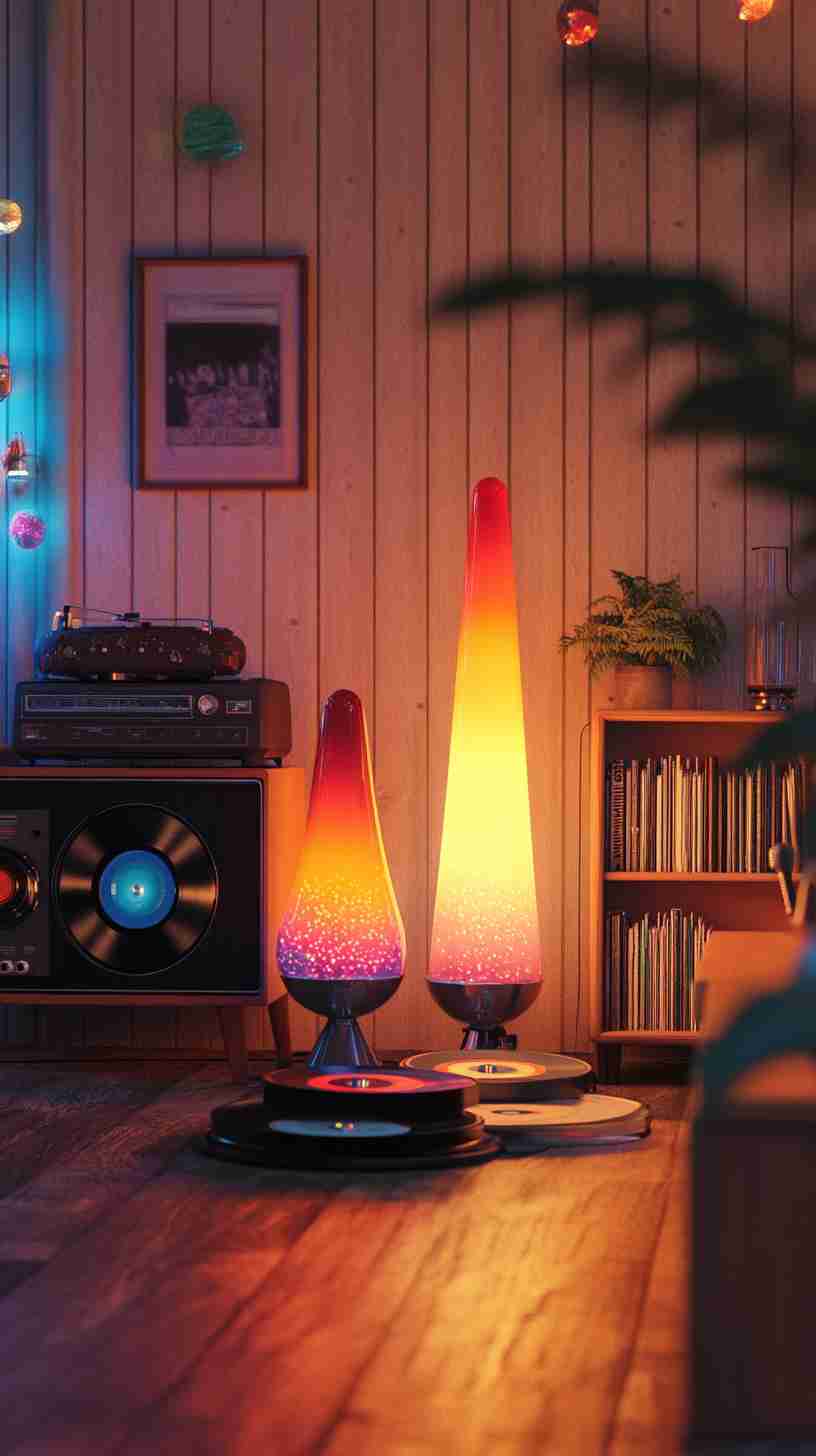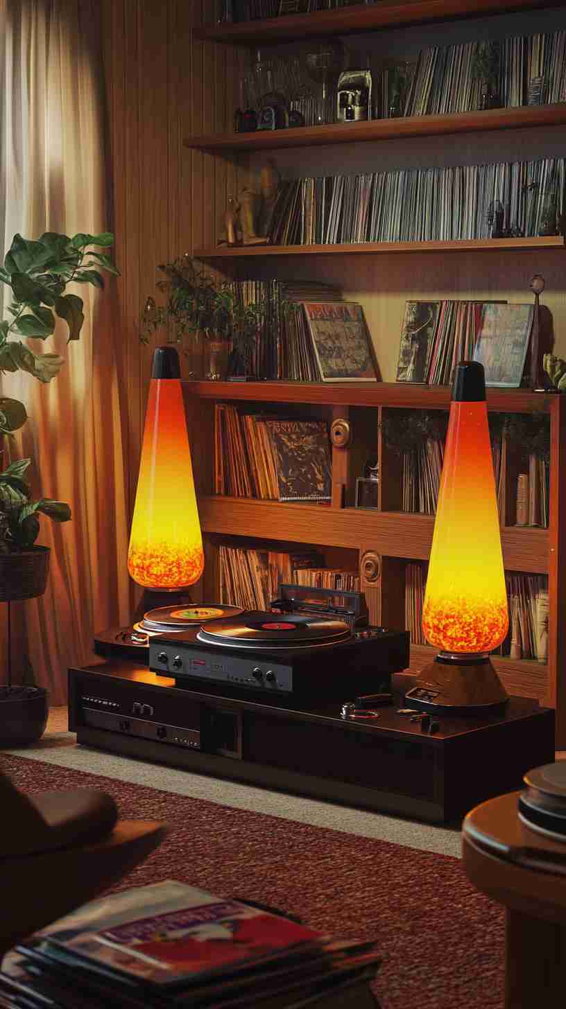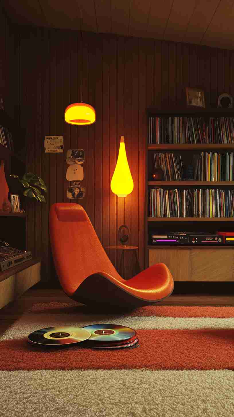 - Iconic Design Elements: Geometric patterns, lava lamps, vinyl record players, sunburst mirrors, or pop-art posters, reflecting the decade’s cultural and design trends.