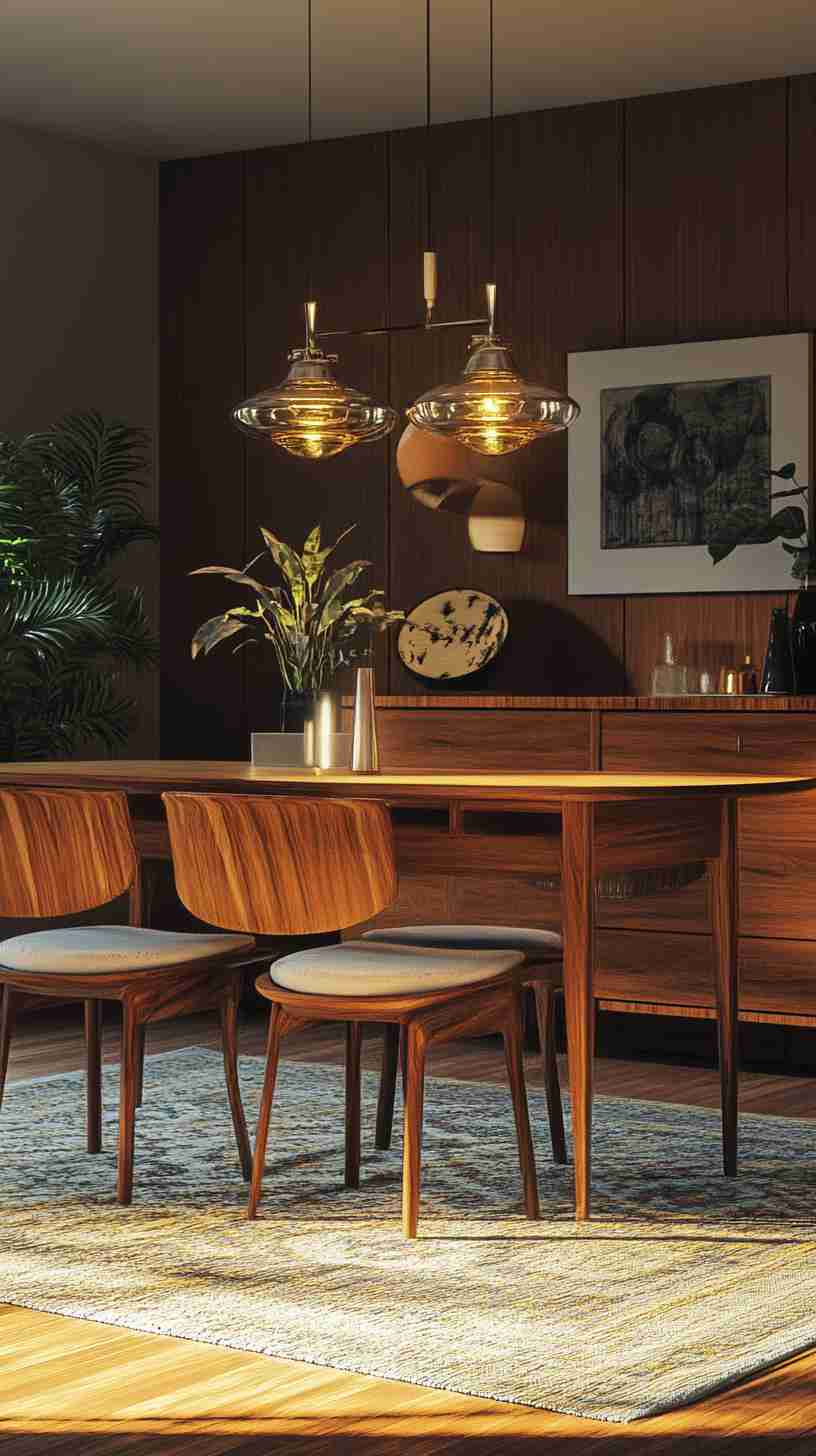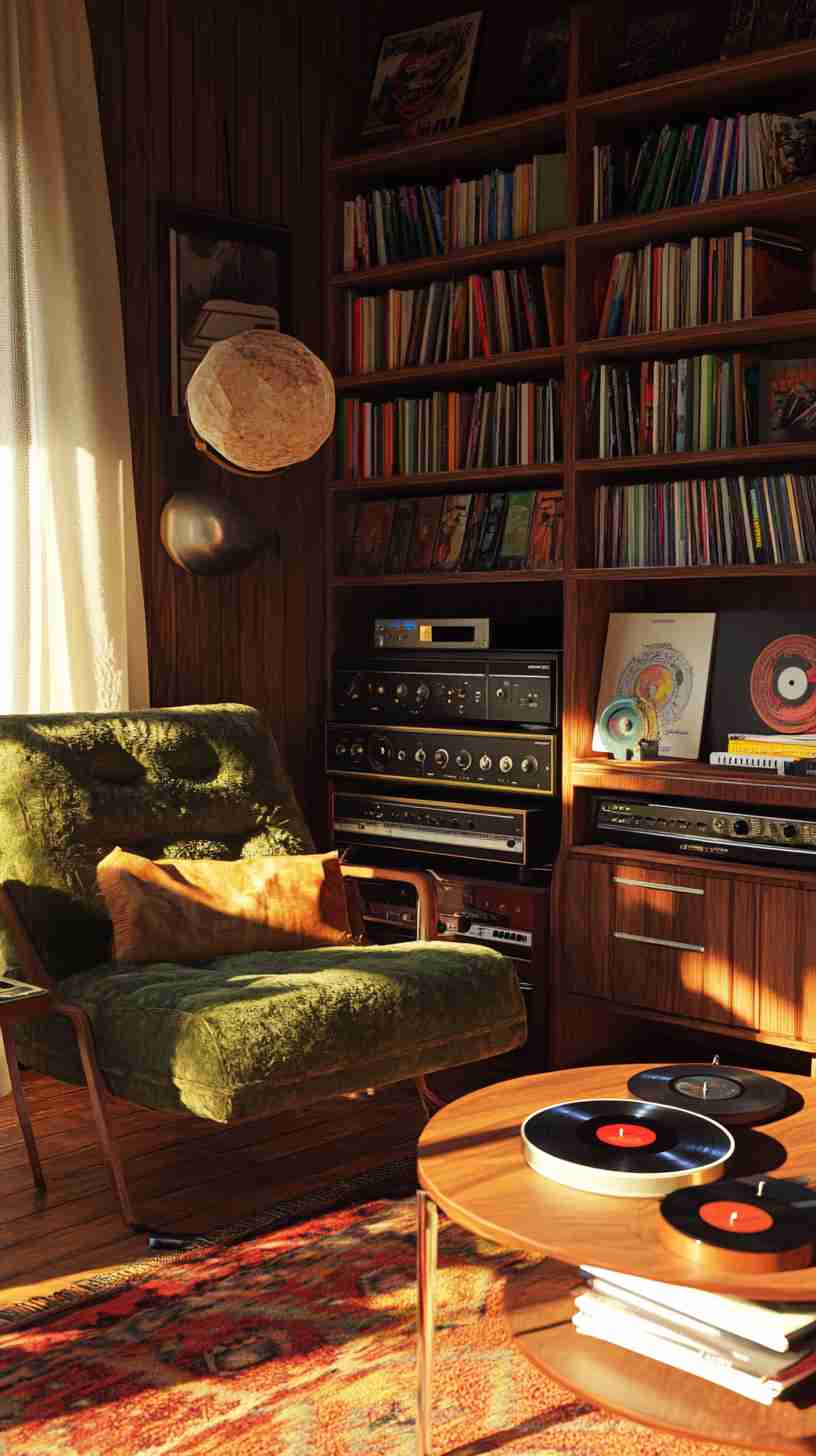 - Retro Aesthetic Details: High-definition images of 1970s interiors, featuring shag carpets, wood-paneled walls, bold floral or geometric wallpapers, and iconic furniture like bean bag chairs, teak credenzas, or sunken sofas.