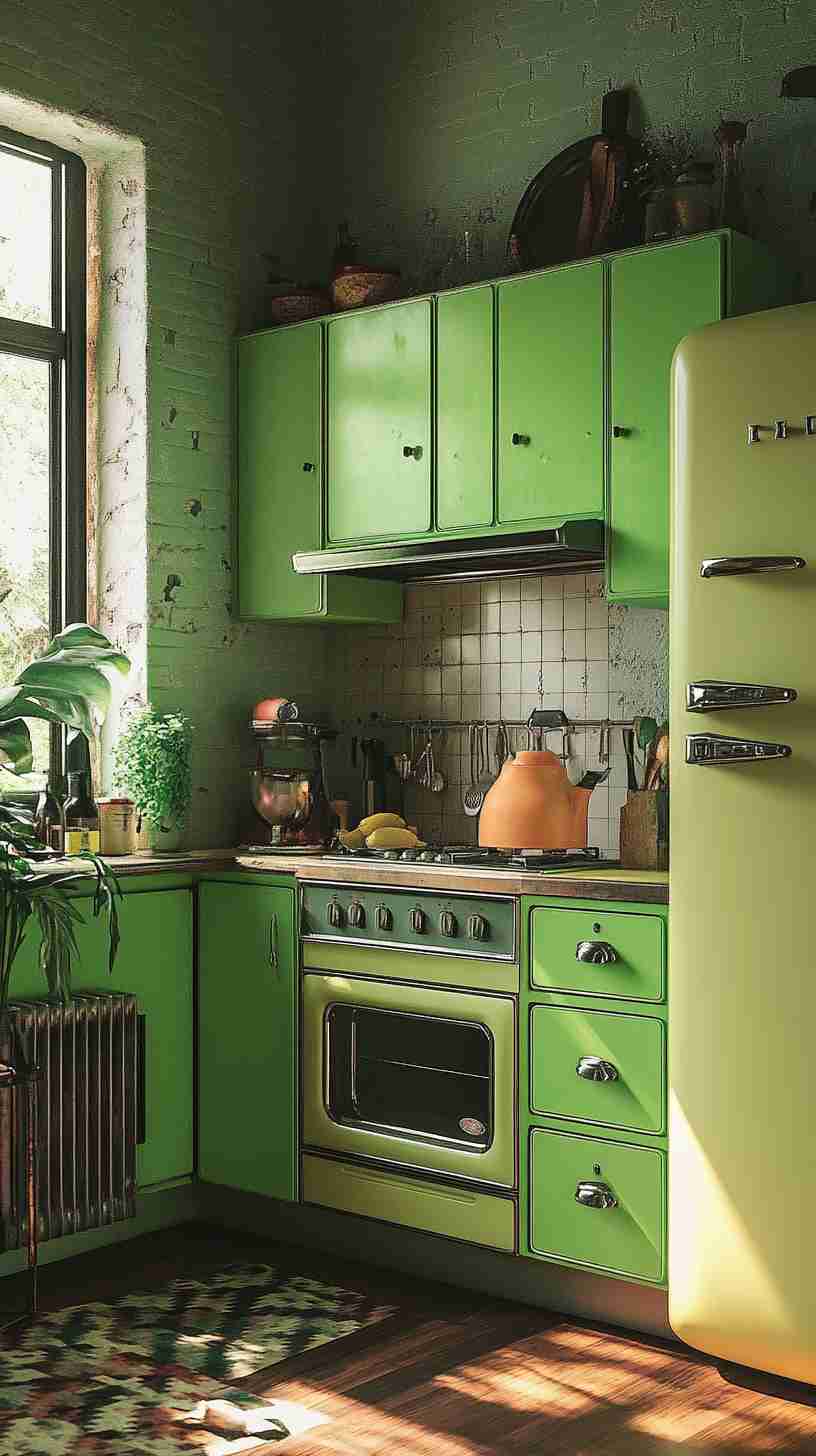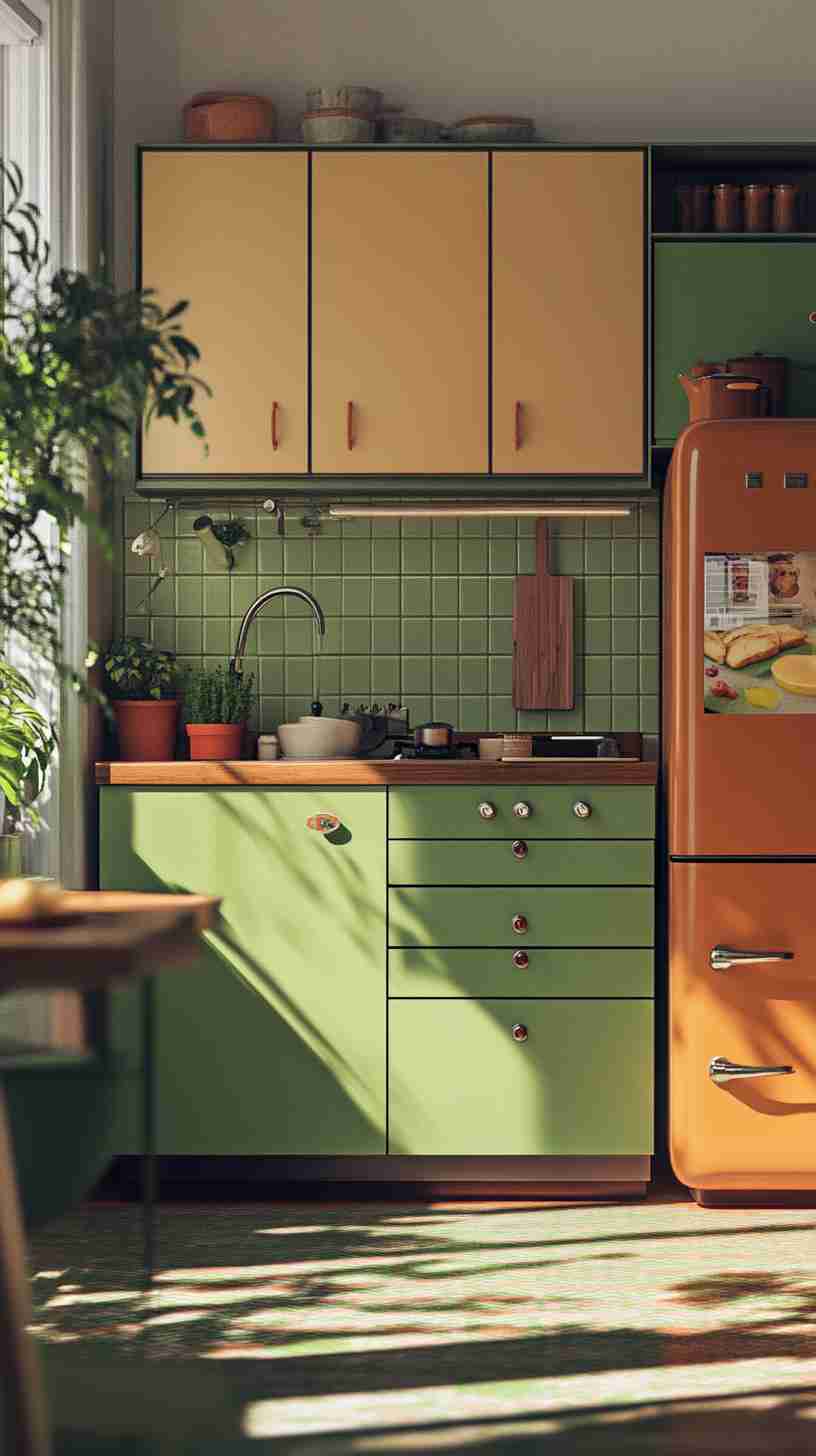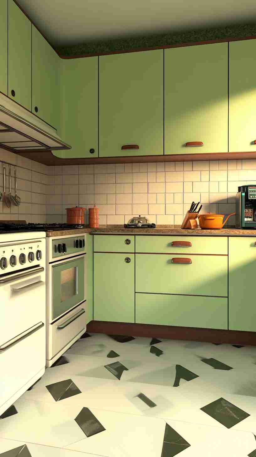 - Retro Kitchens: Kitchens with avocado-green appliances, Formica countertops, and floral or geometric wallpaper, capturing the 1970s domestic charm.