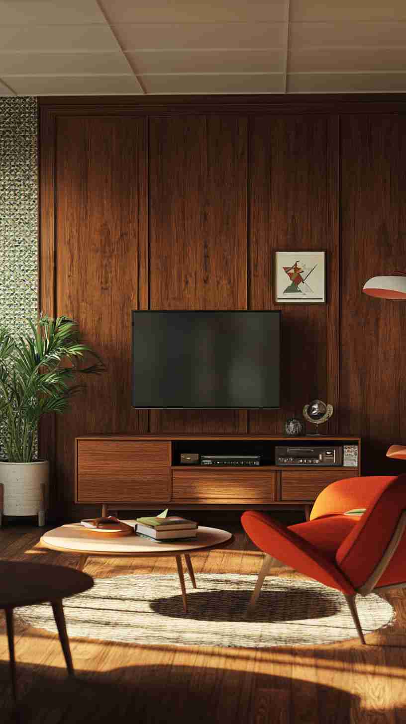 - Retro Aesthetic Details: High-definition images of 70s interiors, featuring shag carpets, wood-paneled walls, bold floral or geometric wallpapers, and iconic furniture like bean bag chairs or teak credenzas.