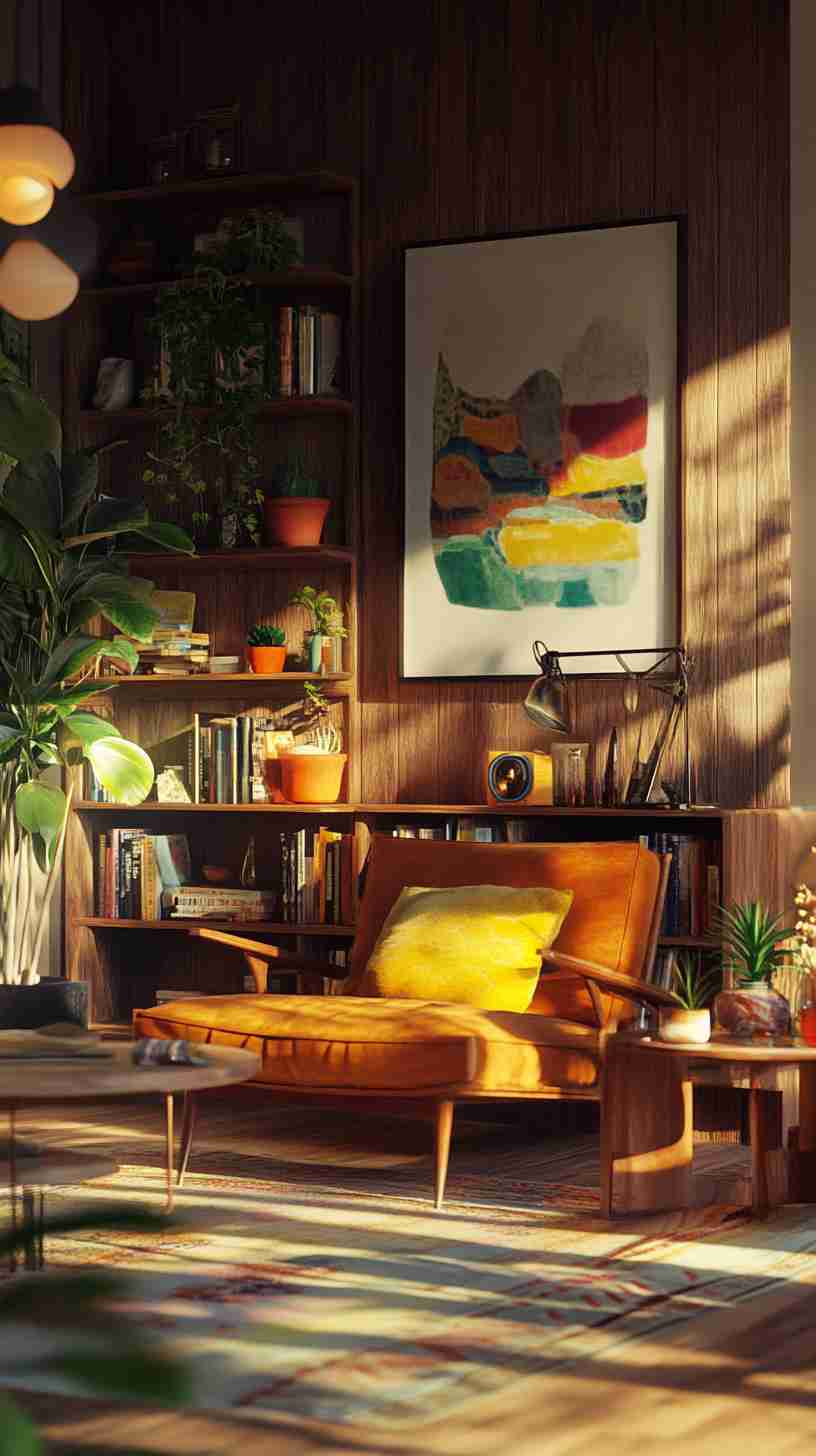 In compact areas like hallways or reading nooks, a tablet or small screen displaying a 4K 70s interior wallpaper can add depth and a sense of nostalgia, mimicking the effect of a window to a vibrant retro scene.