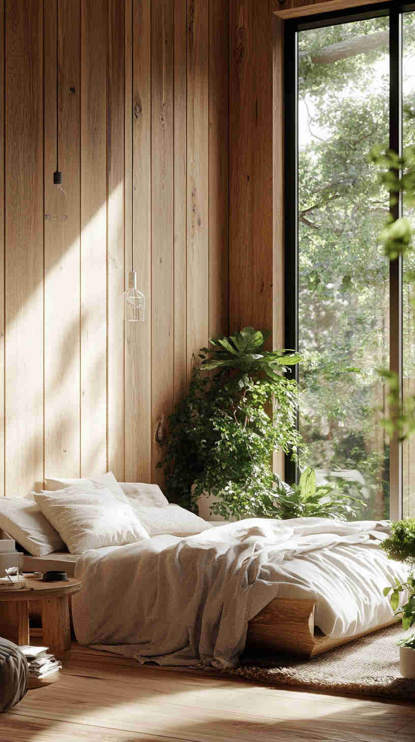In the bedroom, wallpapers depicting serene cabin interiors, like a loft bedroom with mountain views or a snug space with warm lighting, create a relaxing and intimate environment. A design with soft wood tones or cool blues promotes restful sleep with a touch of rustic charm.