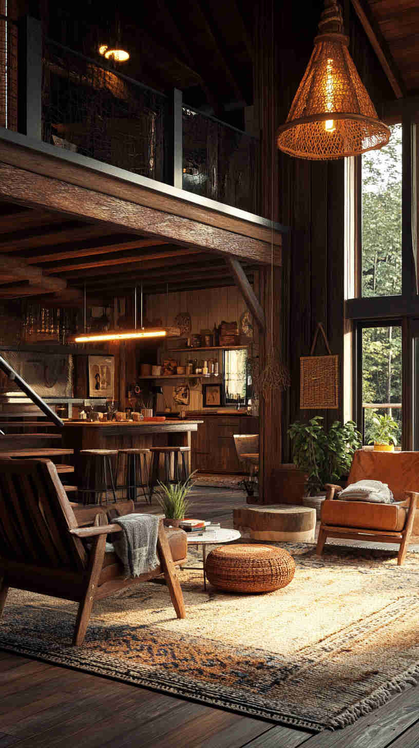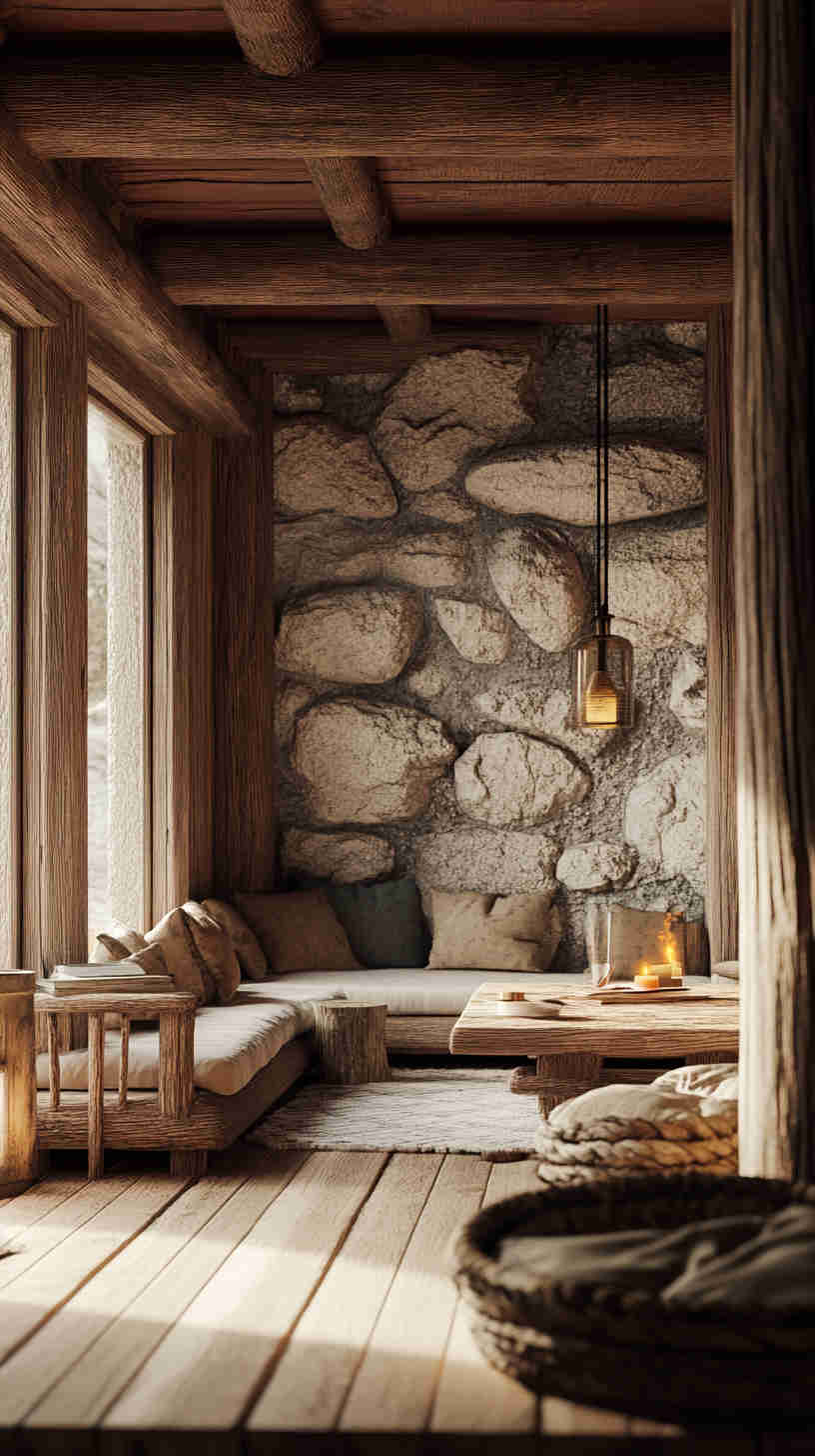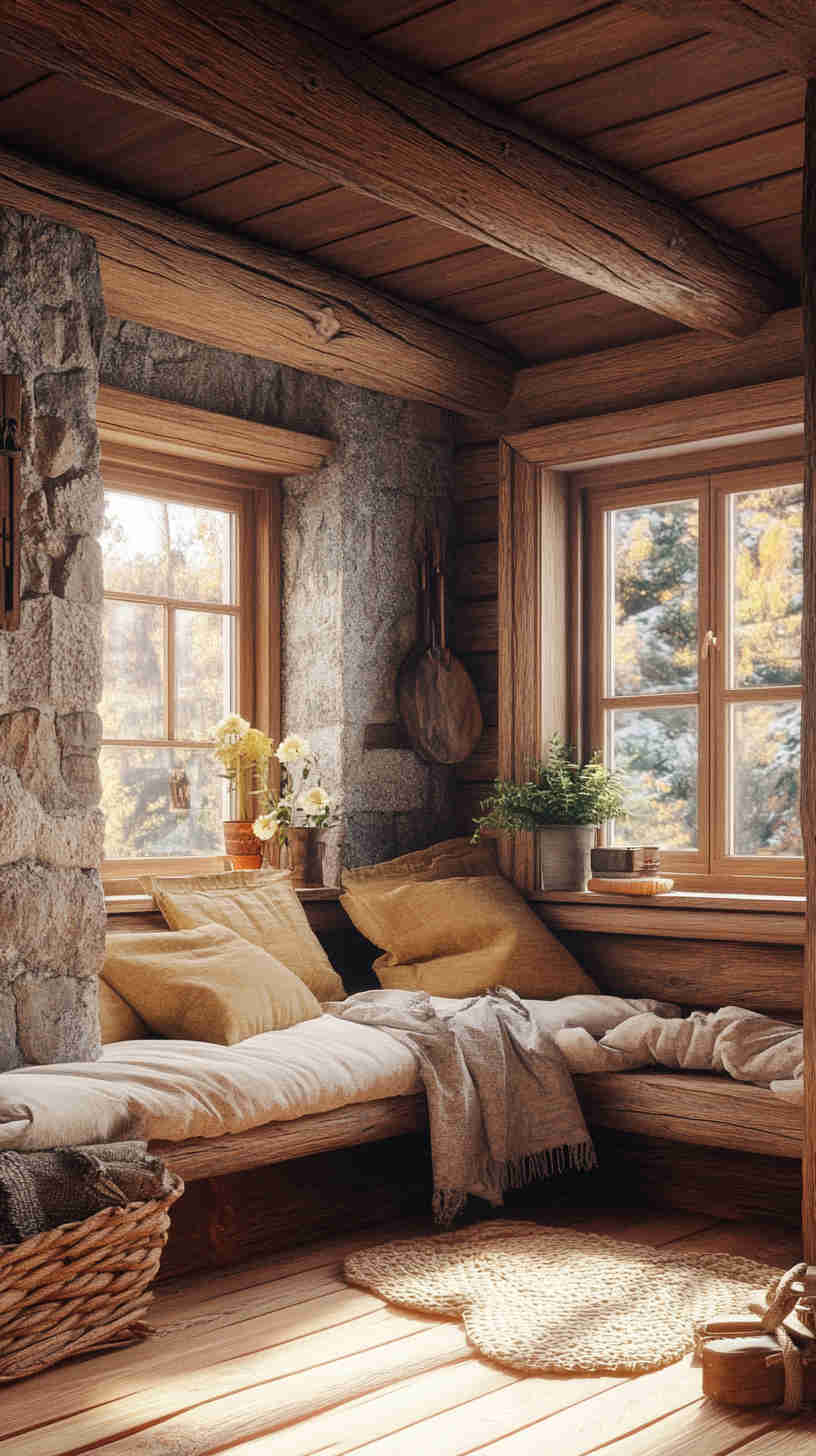 - Vivid Color Palettes: Rich wood tones, soft neutrals, warm firelight oranges, and cool blues from window views, reflecting the natural and rustic aesthetic.