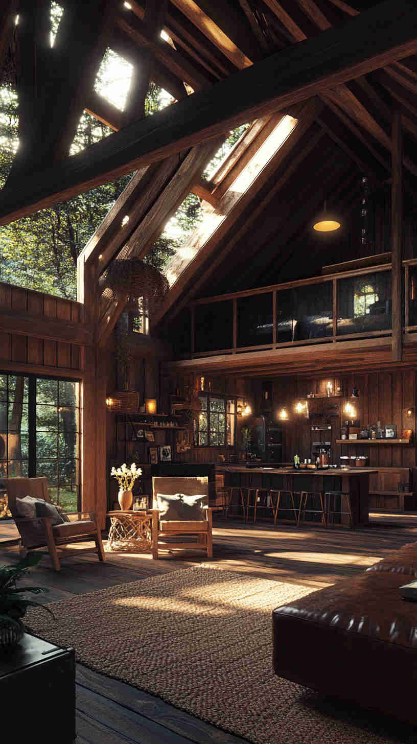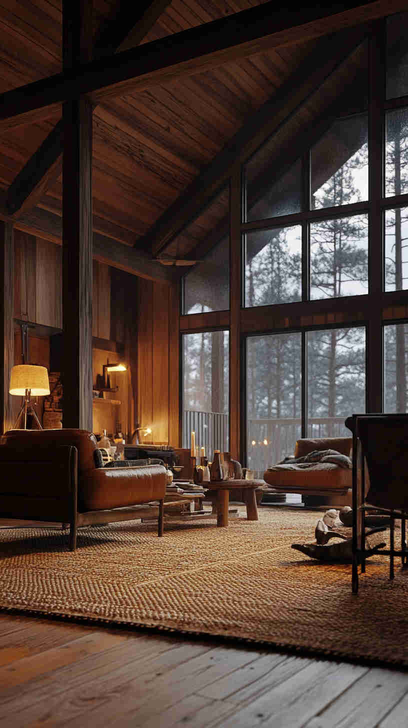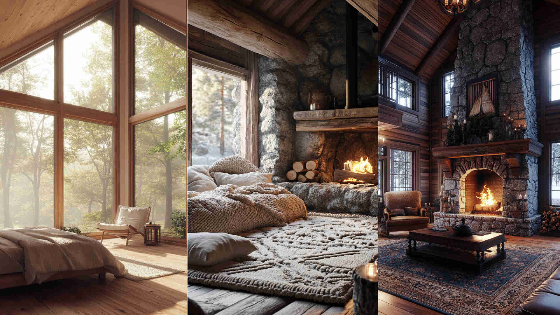 - Natural Details: Elements like stone fireplaces, pinewood floors, large panoramic windows, or forest/mountain views, emphasizing the cabin’s harmony with nature.