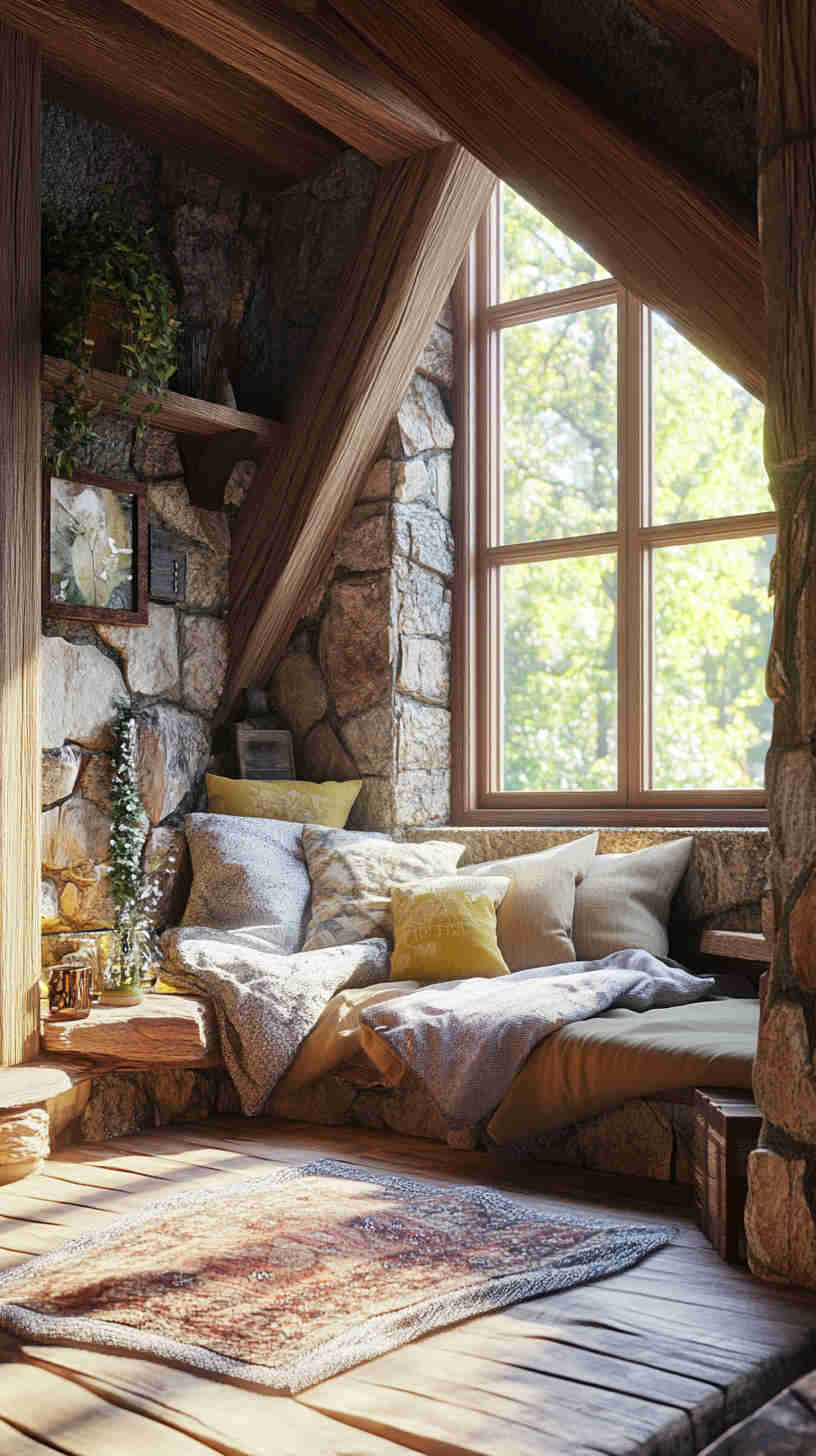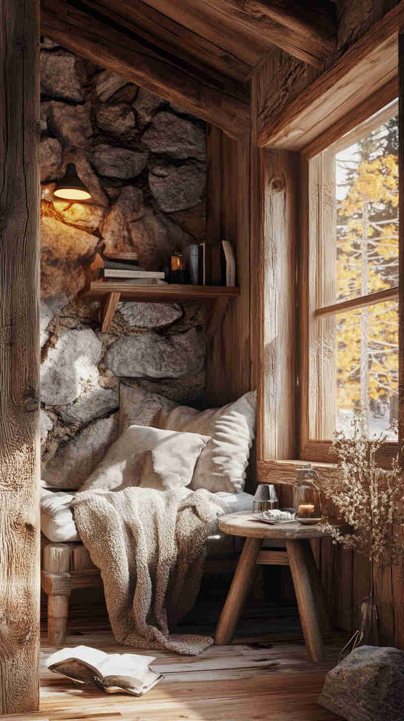 - Tranquil and Warm Vibes: Scenes blending comfort and serenity, such as a reading nook by a fireplace or a loft bedroom with snow-capped mountain views, capturing the essence of cabin life.