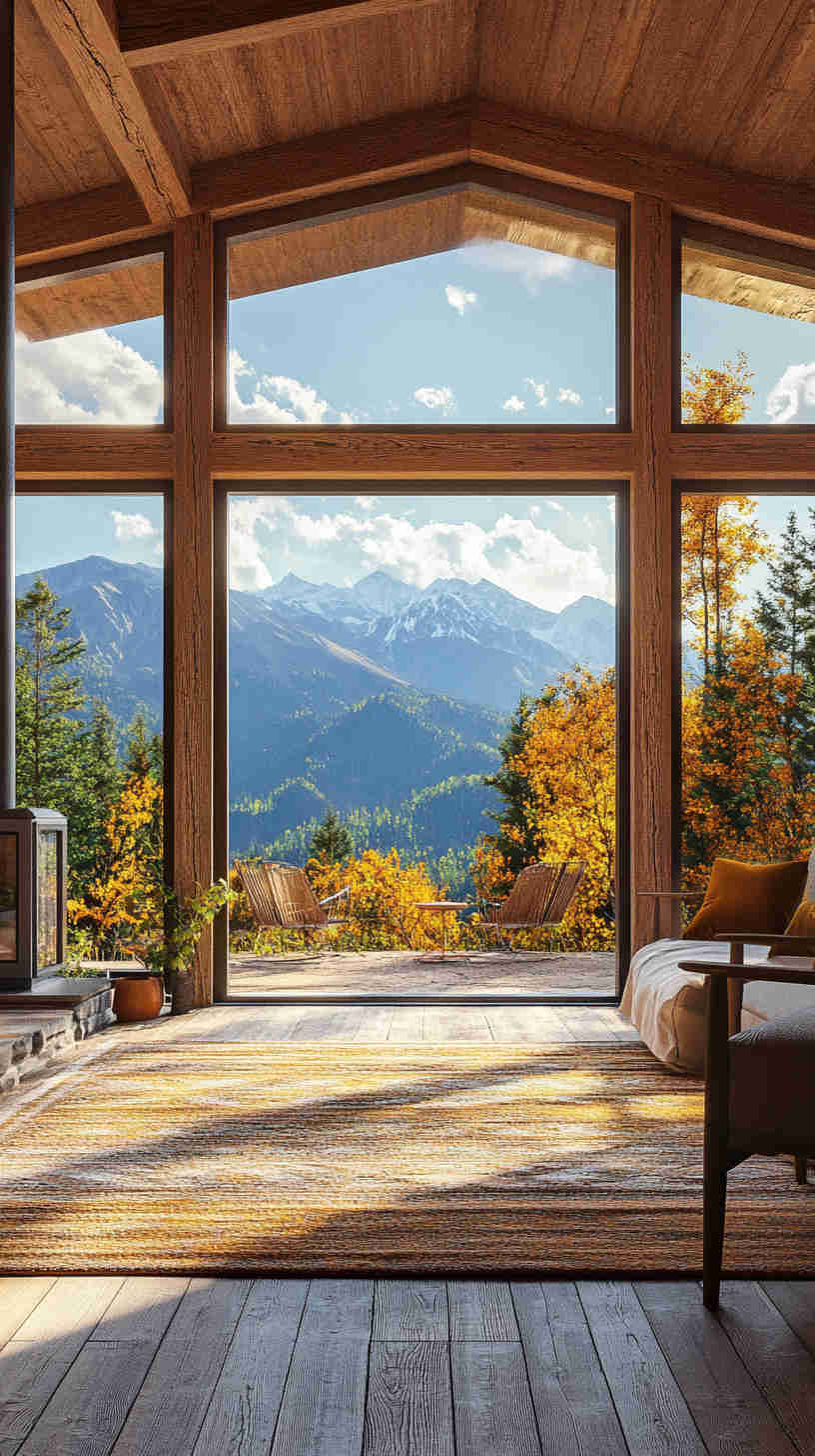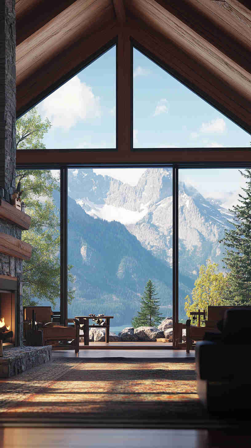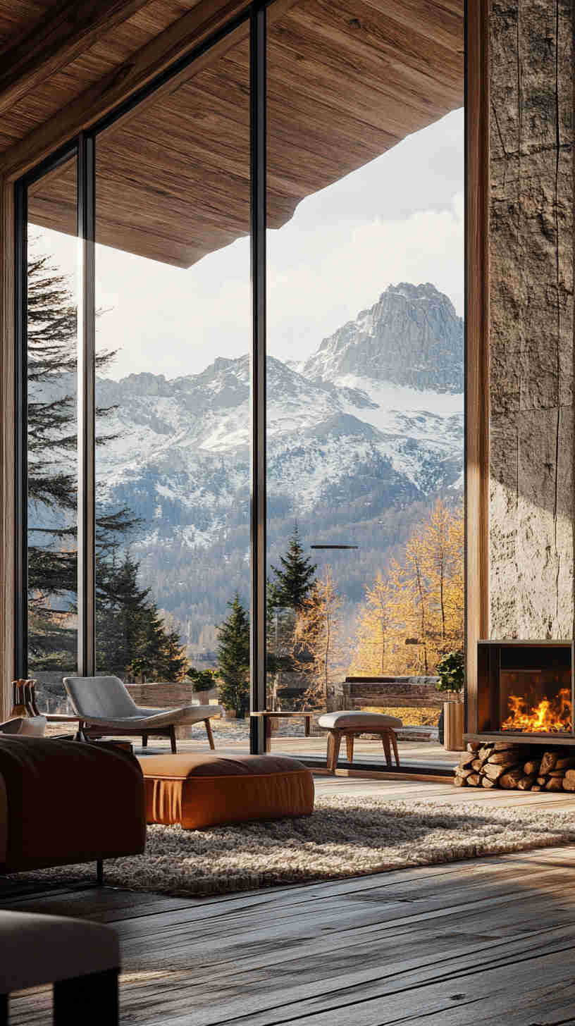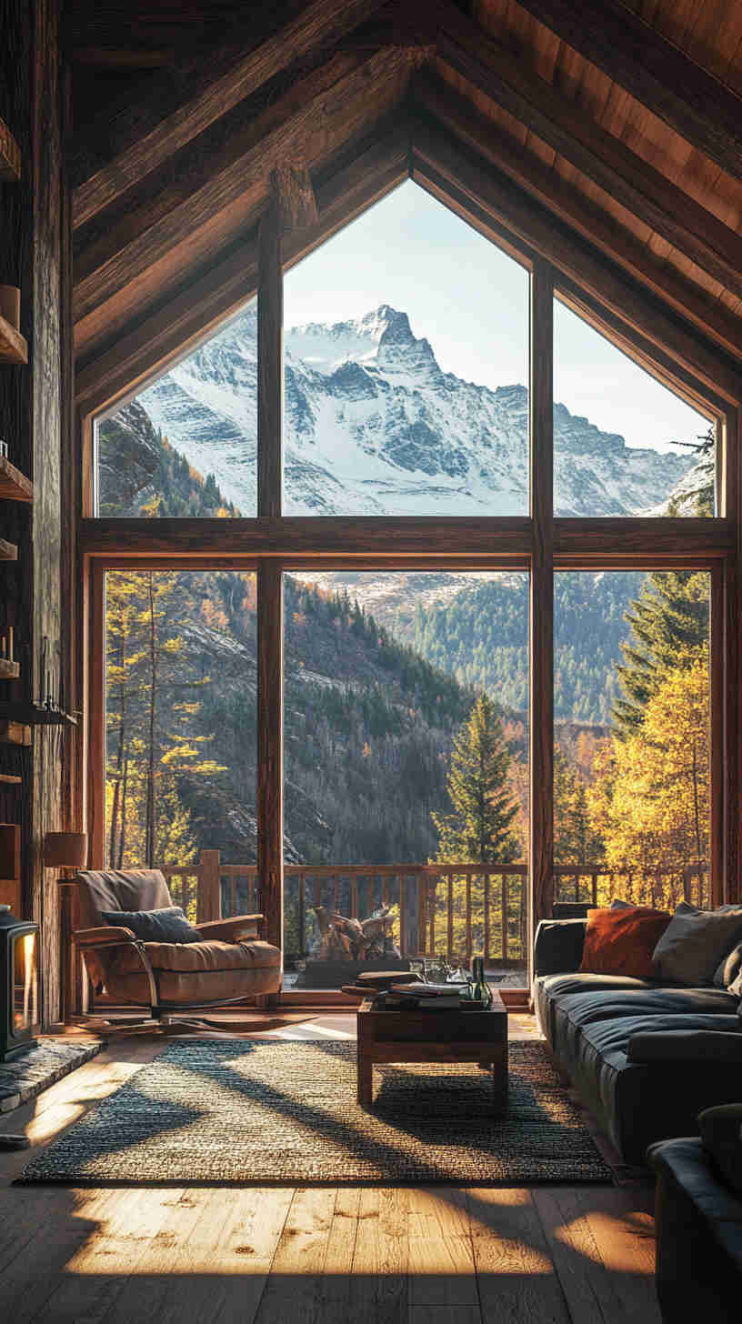 - Snowy Mountain Retreats: Interiors with snow-dusted window views, warm lighting, and winter decor, highlighting seasonal cabin magic.