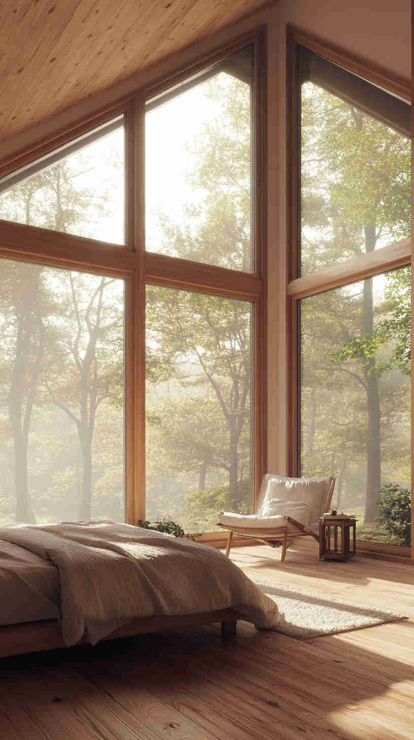 - Loft Bedroom Serenity: Open loft spaces with slanted ceilings, cozy bedding, and large windows revealing forest or mountain views, capturing intimate cabin charm.
