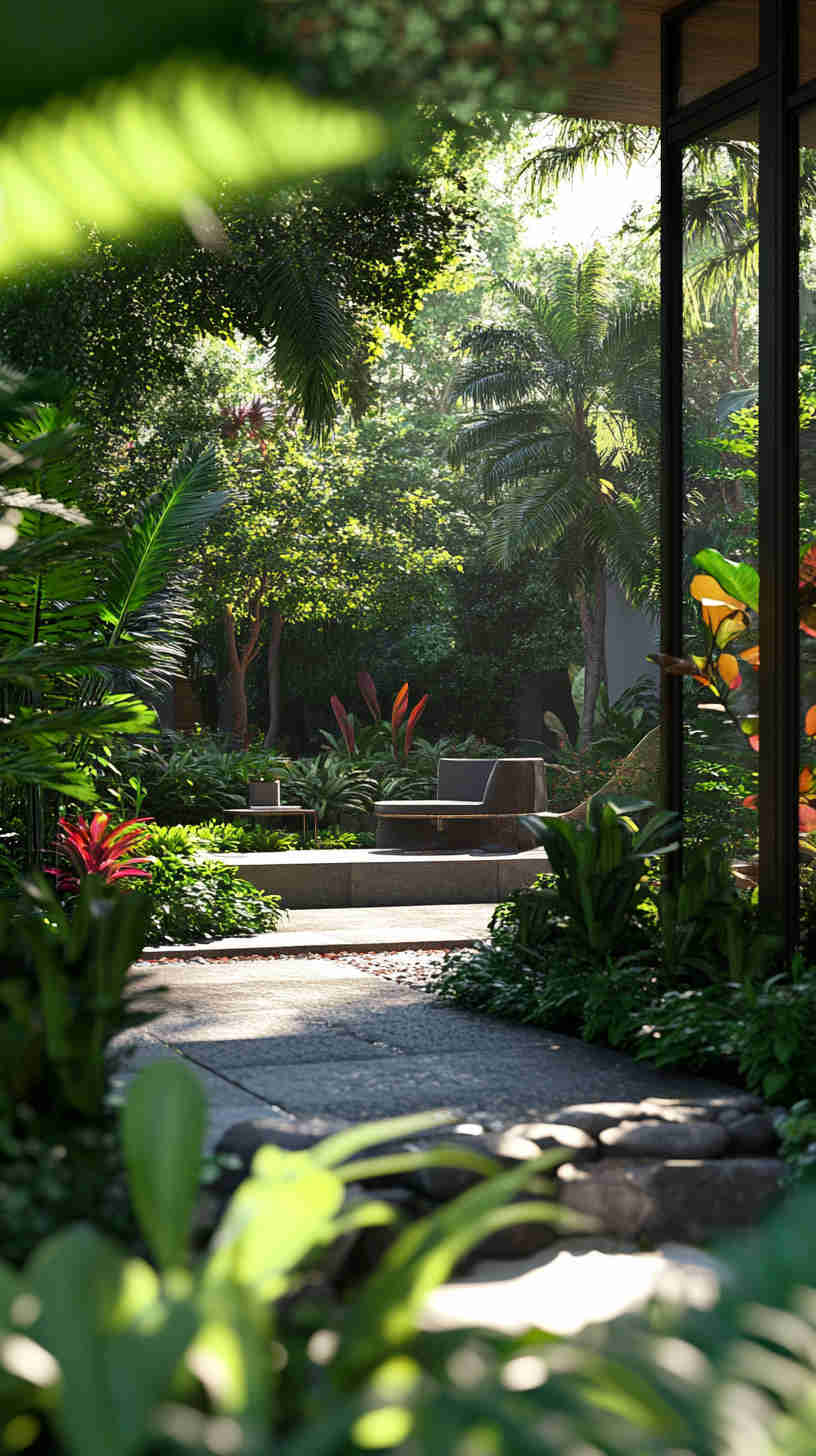 - Tropical Paradise Retreats: Lush palm gardens, vibrant orchids, and tranquil lagoons, capturing exotic outdoor luxury.
