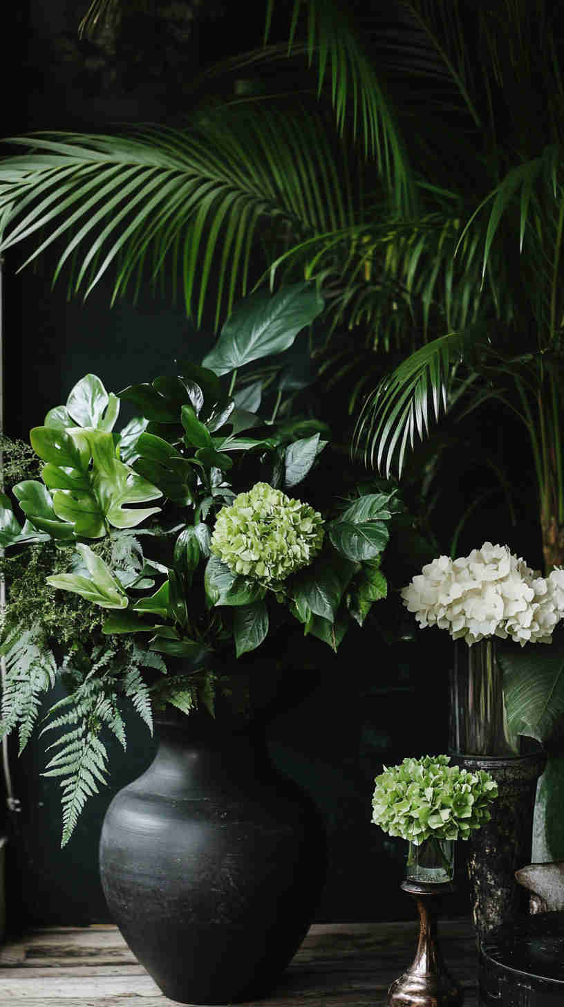 - Moody Tropical Layers: Oversized gunnera leaves, dark ferns, and spiky cordylines in lush, shadowy compositions.