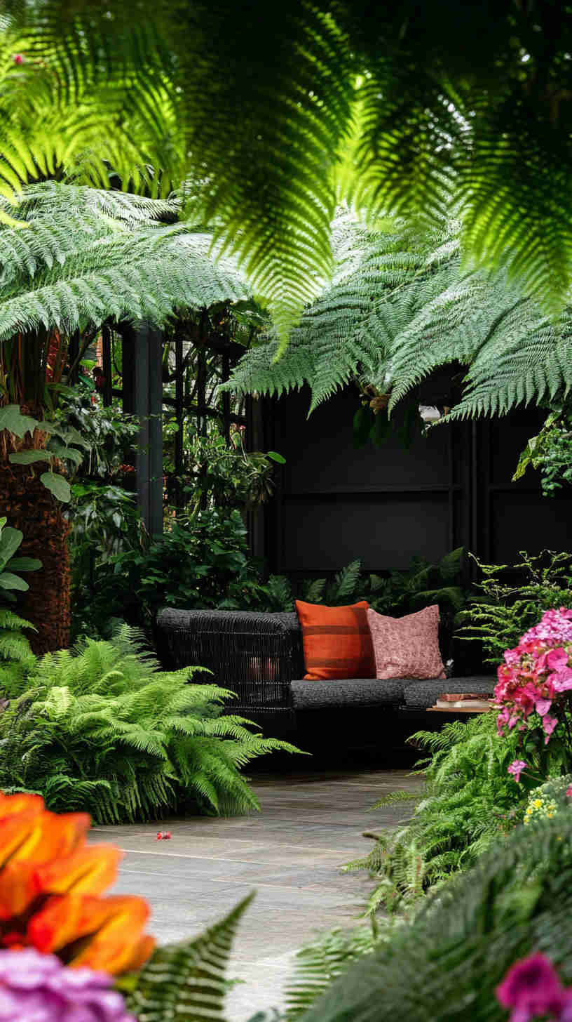 - Midnight Foliage Borders: Dense walls of dark evergreens, black mondo grass, and deep purple heuchera, creating immersive, tunnel-like effects.