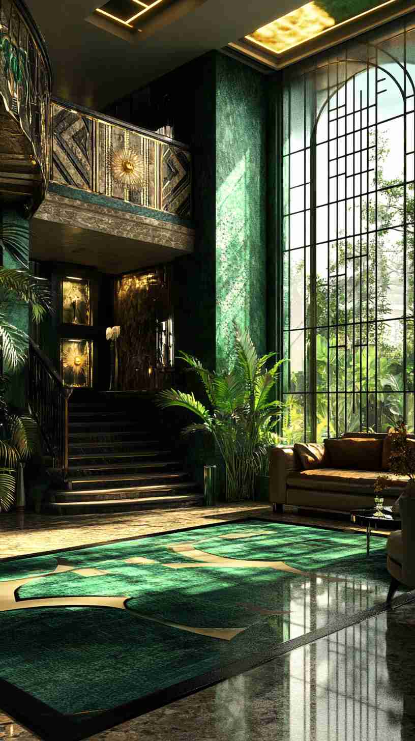 - Tropical Elegance: Incorporating palm leaves, exotic birds, and vibrant greens, these wallpapers blend Art Deco with tropical influences for a fresh, modern twist.