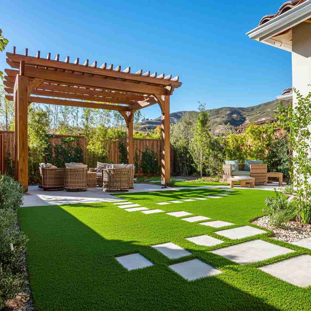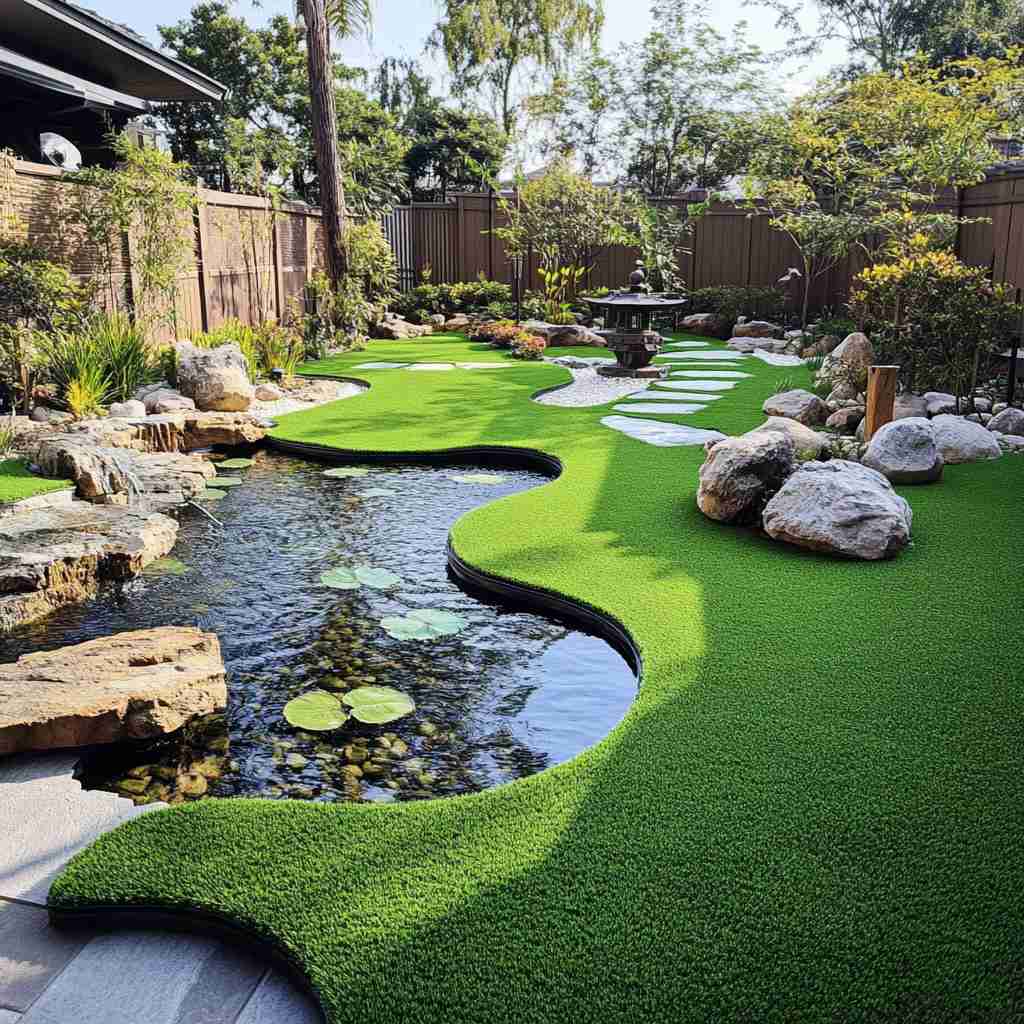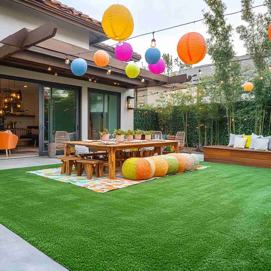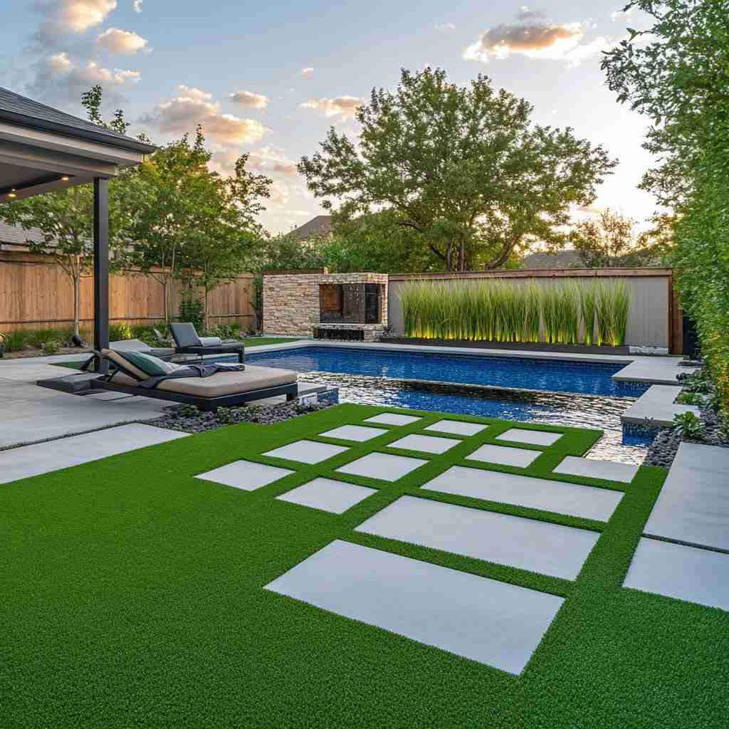 - Tropical Backyards: Artificial grass paired with palm trees, colorful planters, or water features for an exotic, resort-like vibe.