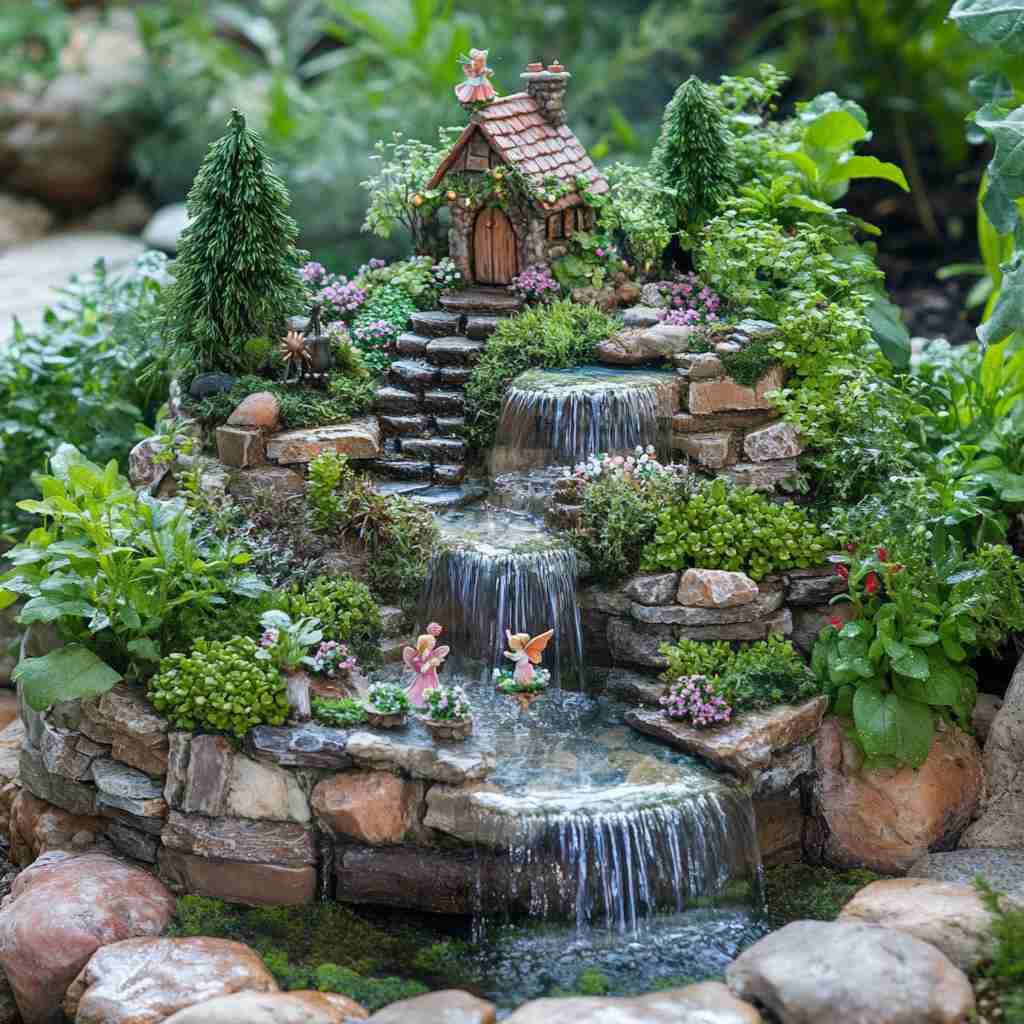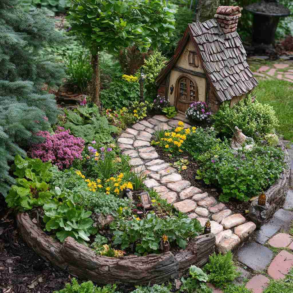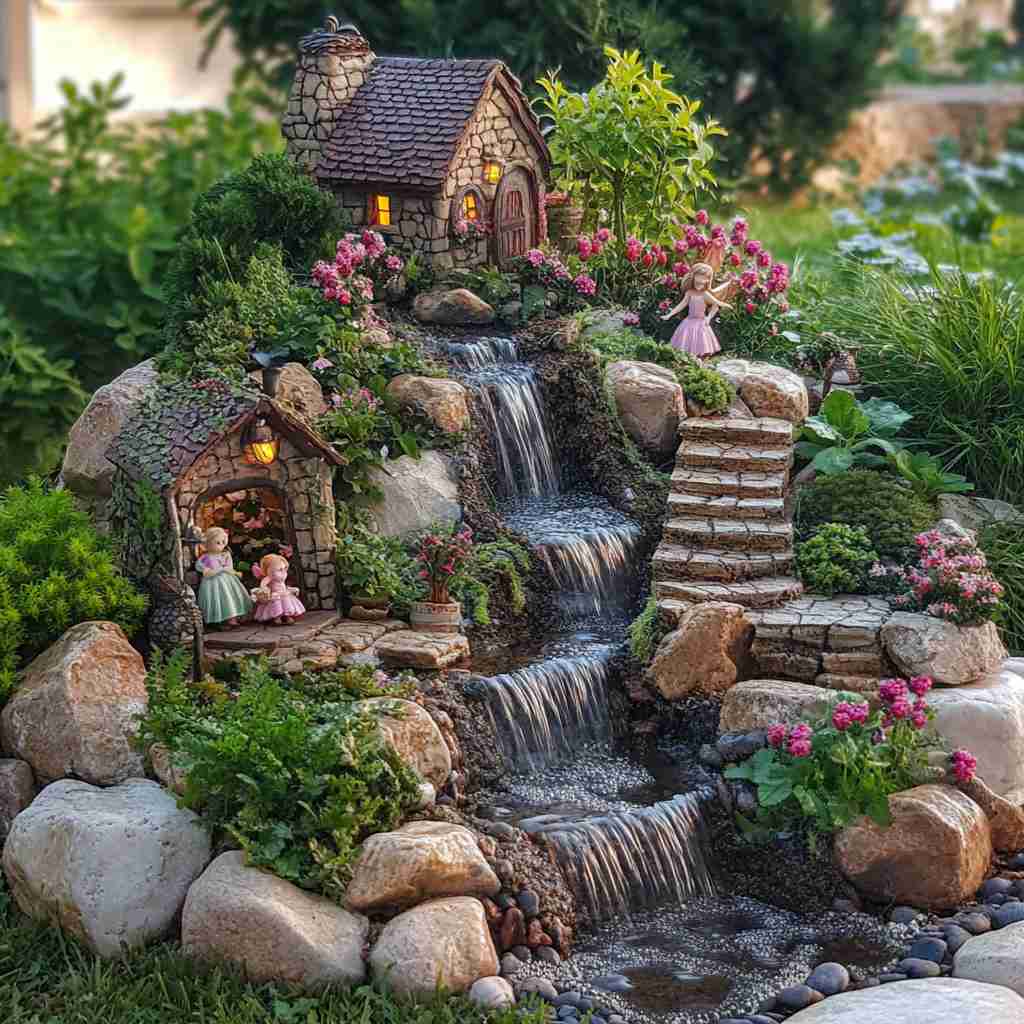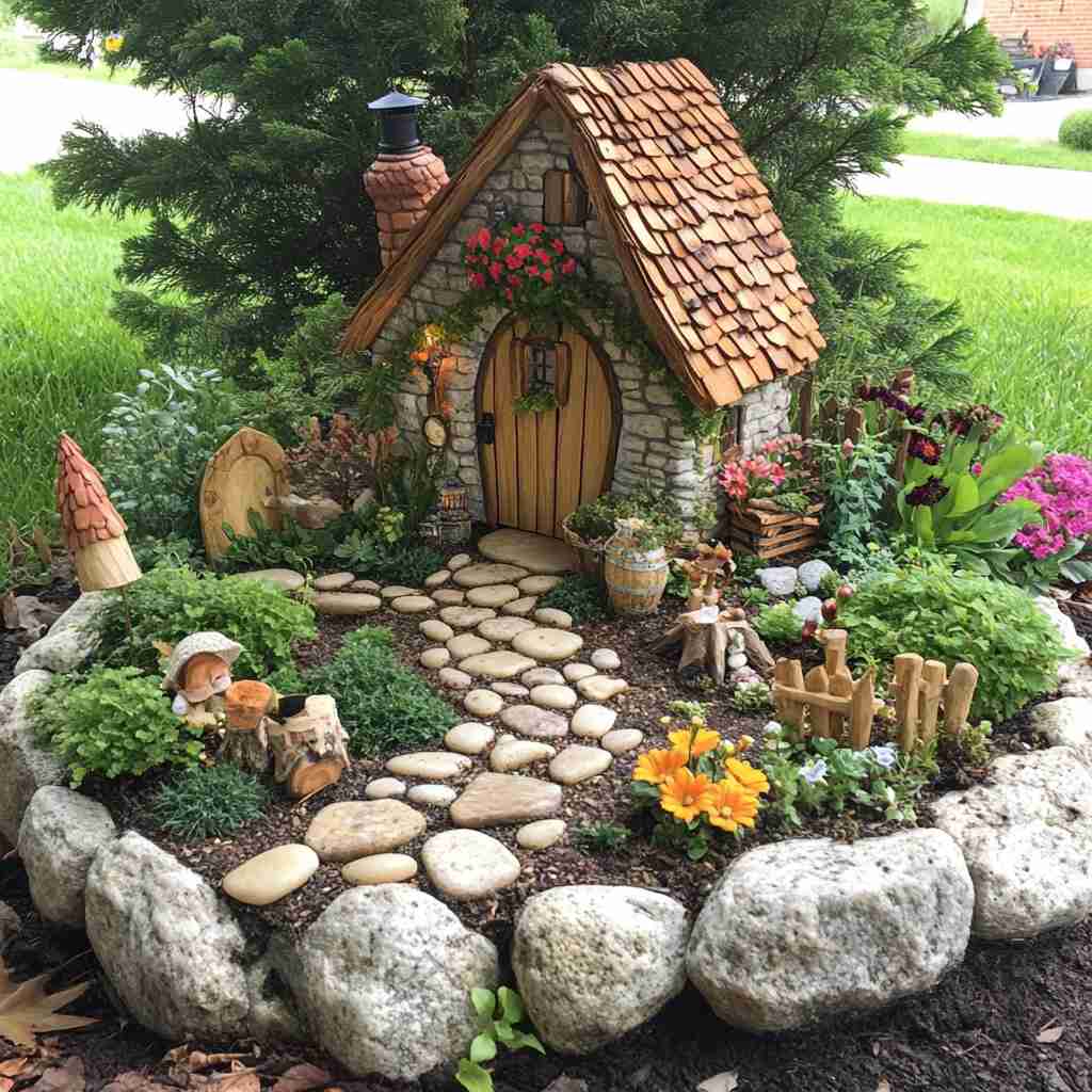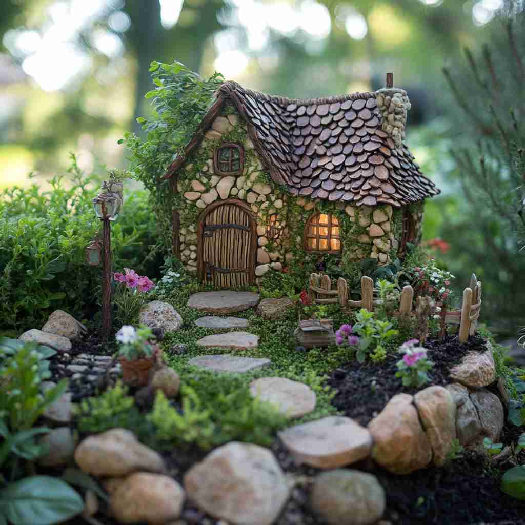 - Structures: Fairy houses, bridges, and benches made from wood, stone, or resin add charm.