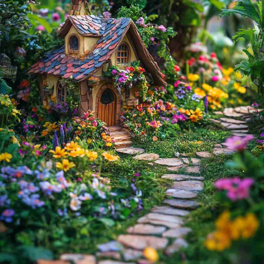 Design a fairy garden around a miniature cottage, complete with a thatched roof and flower boxes. Surround it with tiny roses, lavender, or creeping thyme to mimic a full-sized garden. Add a picket fence made from popsicle sticks and a cobblestone path of flat pebbles. A 4K wallpaper featuring an enchanted cottage can highlight the vibrant flowers and cozy details, helping you choose the perfect plants and accessories.