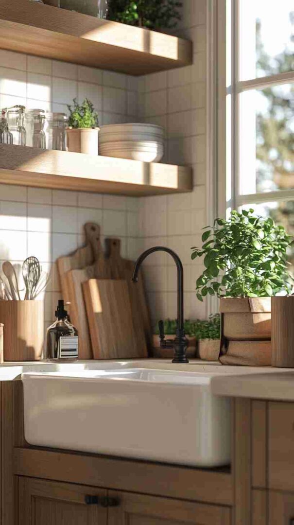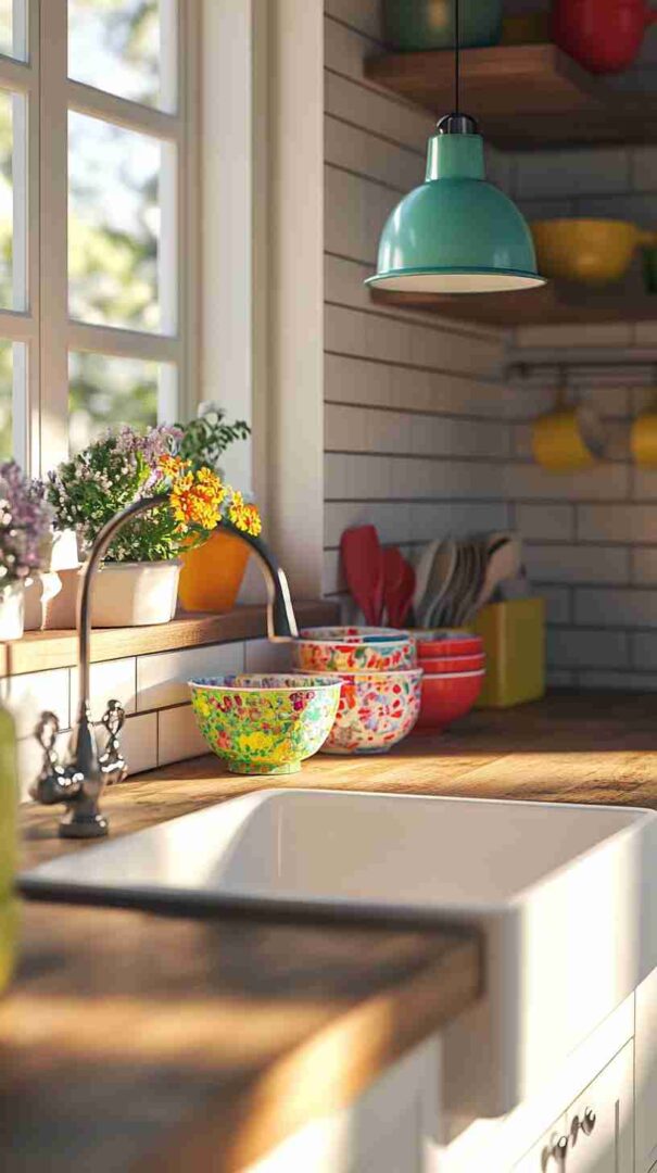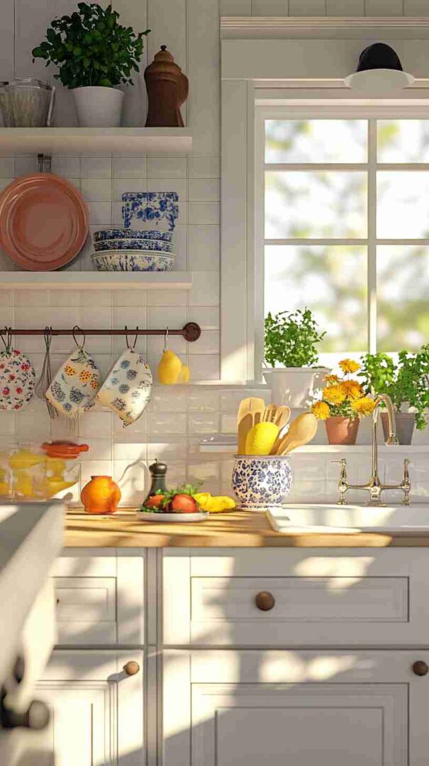 A high-definition wallpaper mimicking classic white subway tiles can create a clean, timeless look. Pair it with shaker-style cabinets painted in soft white or pale blue, and add butcher-block countertops for warmth. Incorporate open shelves to display vintage dishware or glassware for an authentic touch.